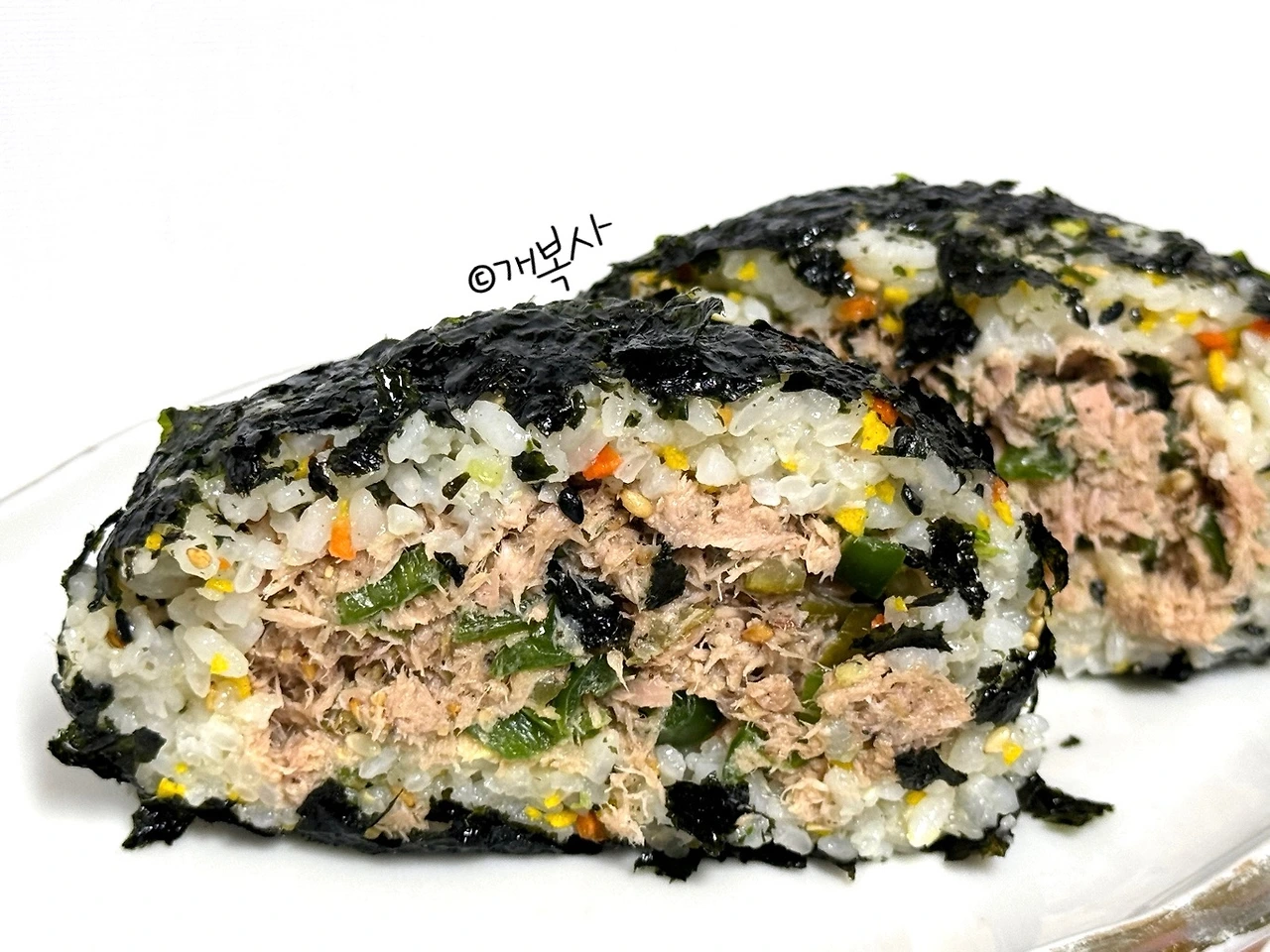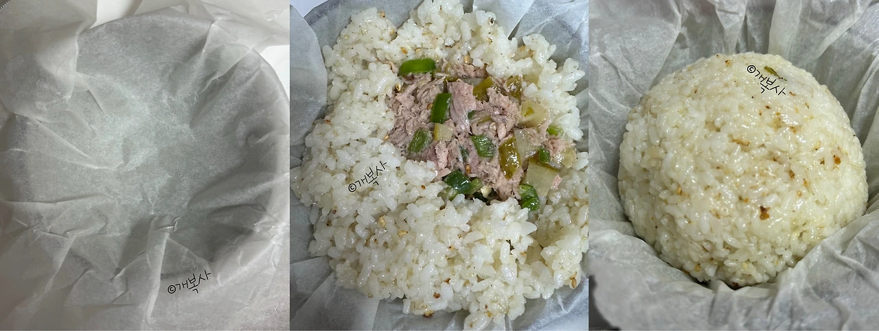 밥그릇에 넉넉하게 자른 쿠킹호일 또는 종이호일 또는 랩을 깔고, 그 위에 밥을 고루 편다. 참치를 능력껏 눌러 채운 뒤, 남은 밥으로 그 위를 덮는다. 호일 또는 랩을 그대로 들어 올려 동그랗게 말아주면 완성! 이대로도 맛있지만, 조미김을 부순 뒤, 주먹밥을 굴려주면 더 아름답고 맛있다.