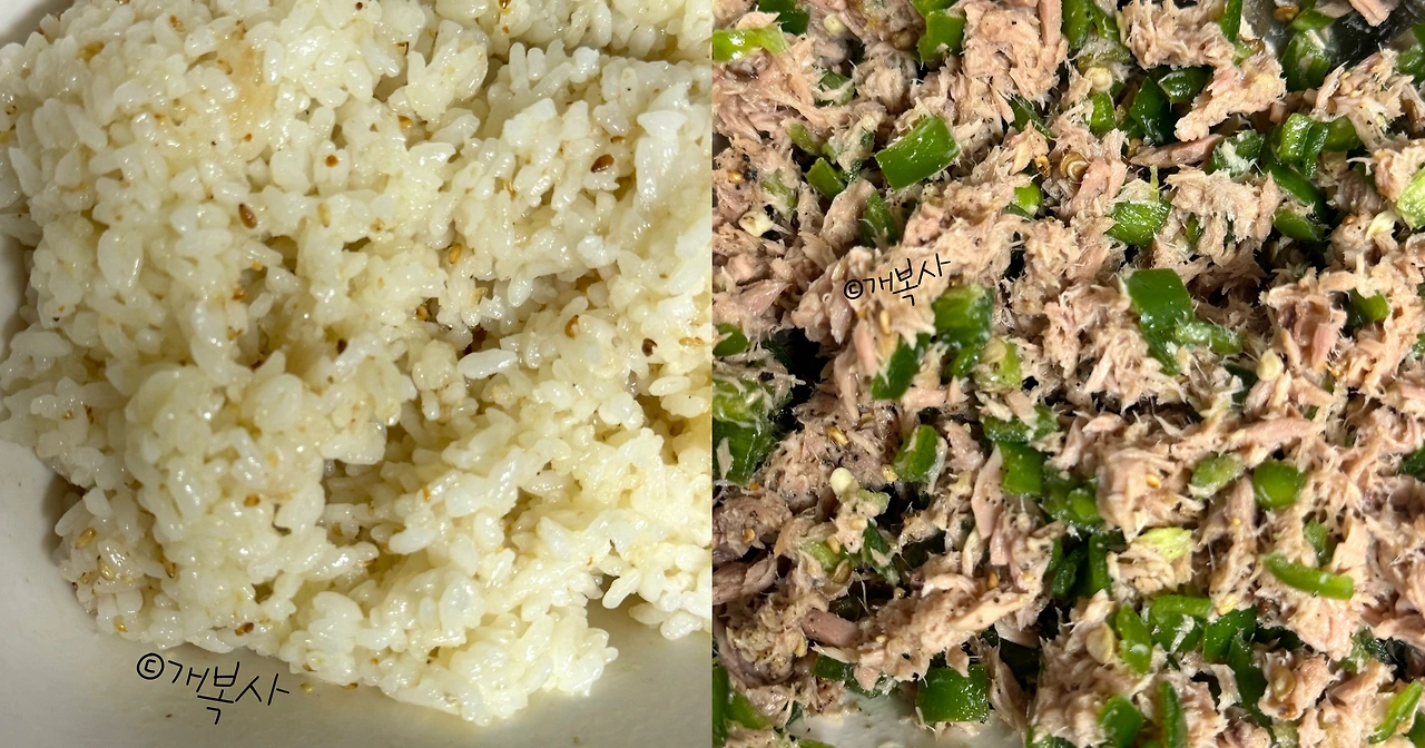 우선, 겉에 붙어있을 이물질 제거를 위해 참치캔을 흐르는 물에 한 번 씻은 후, 깐다. 참치캔을 개봉하면 퓨란이라는 발암물질이 나오는데, 5분 정도 두면 공기 중에 휘발되기 때문에 가장 첫 순서다. 다음은 밥에 간을 할 차례다. 밥 한 공기에 맛소금으로 간을 맞춘 다음, 들기름은 커피 스푼으로 1 숟갈, 통깨는 취향껏 넣어 섞는다. 고추는 흐르는 물에 뽀득 씻은 뒤 다지는데, 가위로 해도 괜찮다. 이때, 단무지나 피클 등 같이 넣을 재료가 있다면 함께 다져둔다. 이제 퓨란이 충분히 날아갔을 참치캔의 기름을 쭉 빼고, 다진 재료를 넣어 간을 한다. 맛소금 톡톡톡, 후추 툭툭, 참치마요를 원한다면 마요네즈 2~3바퀴를 넣고 섞으면 고지가 코앞이다.