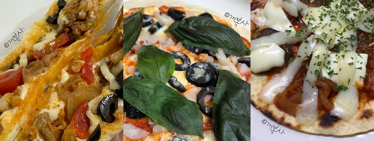 이름에서 알 수 있을 것이다. 빵 대신 또띠아를 사용한다. 도우가 얇은 피자를 흉내 낼 수 있는데, 이상하게 나는 또띠아만 먹으면 배가 아파서 또띠아를 찾다 찾다가 포기한 피자다. 시판 또띠아를 사다가 테스트해 보았지만, 다 똑같은 놈들이었다. 또띠아 피자는 생 토마토보다는 토마토 소스가 더 잘 어울리고 맛있다. 어디서든 쉽게 구할 수 있는 토마토 파스타 소스도 좋고 토마토 홀이나 퓨레도 좋다. 또띠아에 토마토 소스를 넓게 펴 바르고 좋아하는 재료를 토핑으로 올린 뒤, 치즈 올려서 익혀 먹으면 끝! 파인애플 피자를 좋아하면 파인애플을, 콤비네이션 피자를 좋아하면 슬라이스한 양파+블랙 올리브+옥수수콘을, 불고기 피자를 좋아하면 불고기를, 페퍼로니 피자를 좋아하면 페퍼로니를 듬뿍 올리면 된다. 바질, 루꼴라 같은 채소를 올려 먹으면 비주얼과 건강을 잡을 수 있다. 신선한 생채소가 귀찮거나 부담스럽다면, 파슬리 가루도 좋다. 생각보다 여기저기 많이 쓰이니, 하나 구비해두는 것을 추천한다.