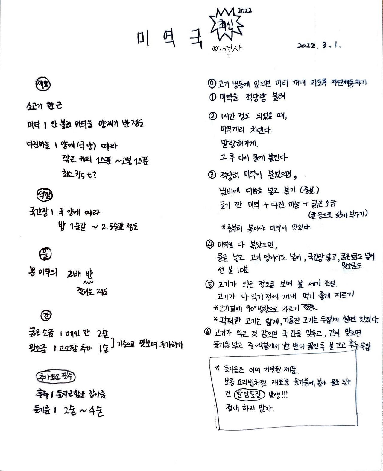 보통 요리법처럼 재료를 들기름에 볶는 것은 발암물질을 발생하게 하므로, 절대 하지 말자. 불린 미역의 물 또는 추가로 넣는 2밥숟 정도의 소량의 물로도 태우지 않고 충분히 볶을 수 있다.