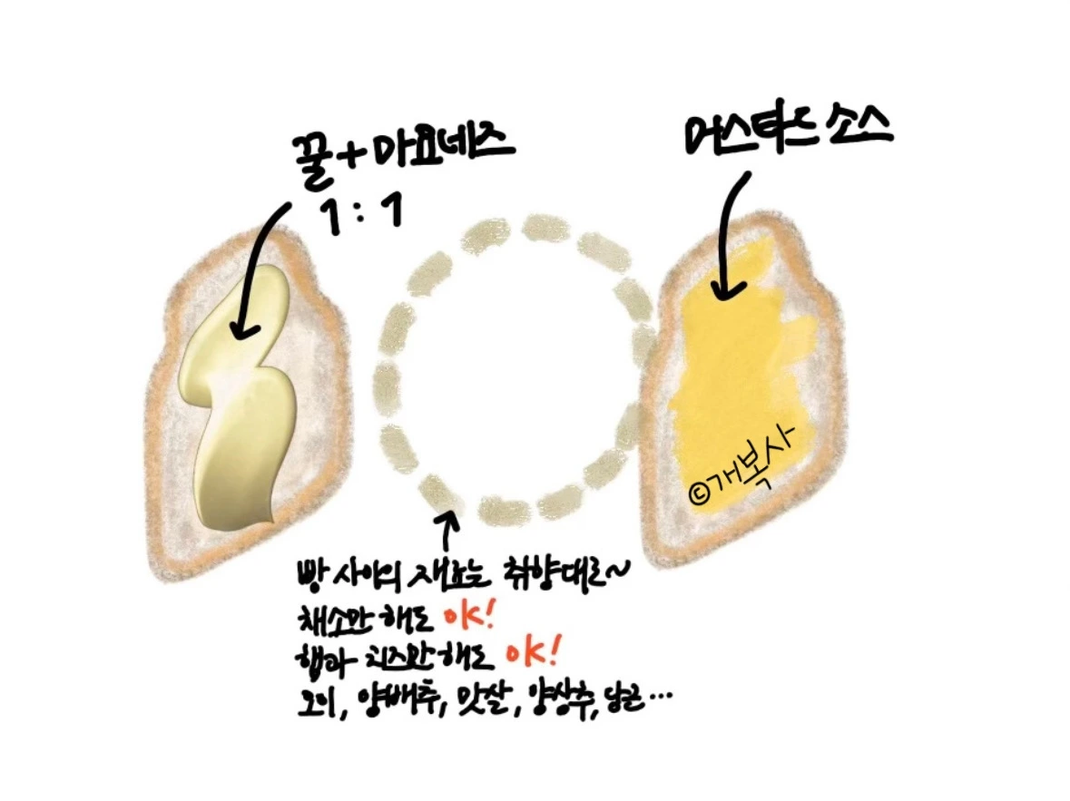한 쪽에는 머스타드를 바르고, 반대쪽에는 꿀과 마요네즈를 1:1 비율로 섞어 바른다. 가운데에 들어갈 재료는 뭐든 상관없다. 햄과 치즈 또는 계란으로 가볍게 가도 좋고, 맛살을 찢어 넣거나, 토마토, 양상추, 양배추, 당근라페 등등 취향대로 원하는 재료를 넣으면 된다.