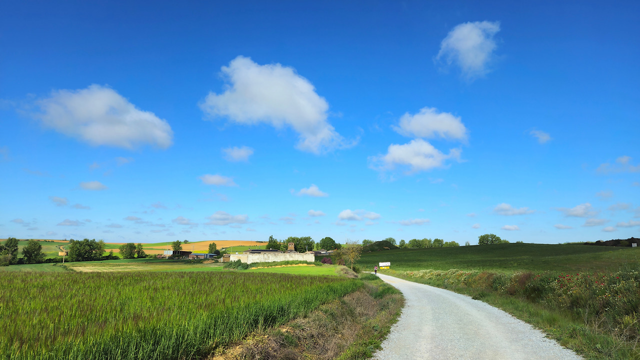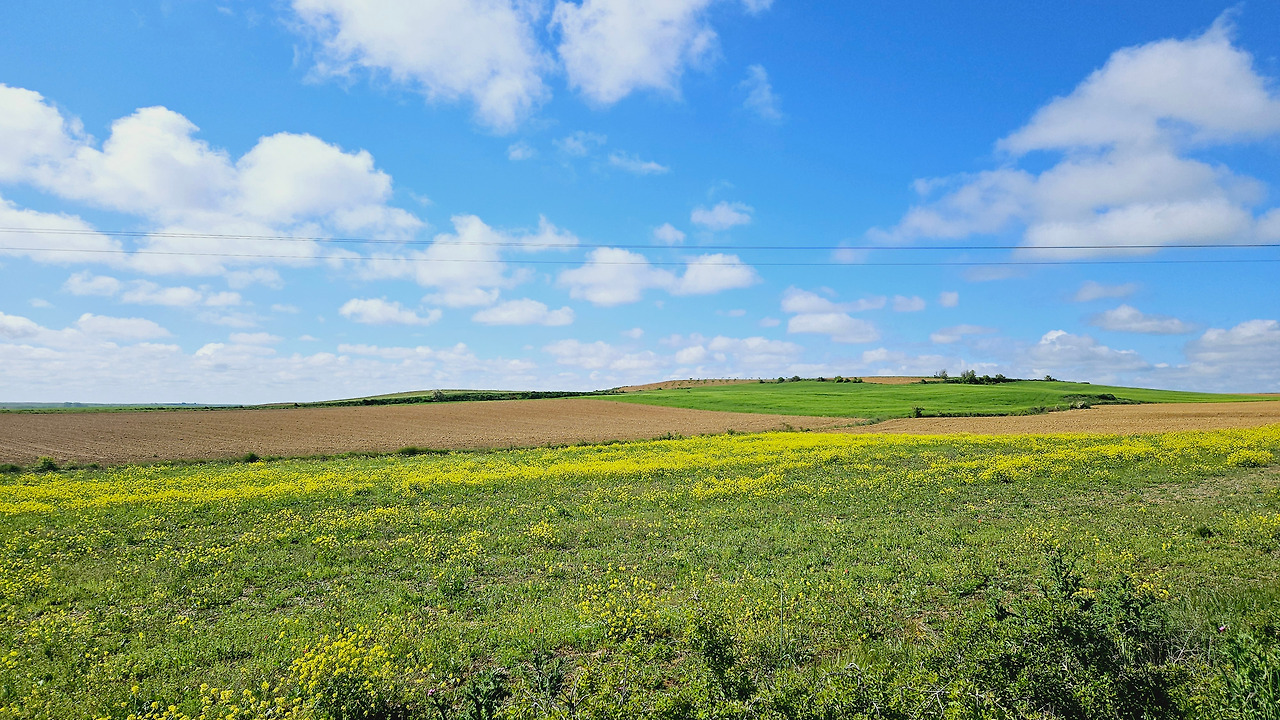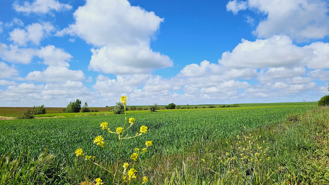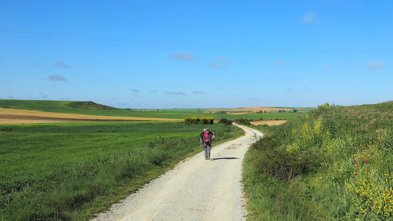 메세타의 진정한 매력은 다양한 색상에서 오는 화려함 같다. 심긴 작물을 통해 다양하고 아름다운 색깔을 순례자에게 선보여 왔다. 포도밭, 보리밭, 밀밭의 초록색과 갈아놓은 밭에서는 갈색과 황토색, 군데군데 남아있는 유채밭의 노란색, 이름 모를 핑크빛 작물들과 불청객처럼 고개 내민 붉은 양귀비까지··· 저 평원 끝까지 이어져 지평선 위로는 파란 하늘과 하얀 구름이 메세타에 폭포처럼 쏟아져 내리고 있다. 아름다움이다. 그것도 싱그러운 아름다움을 이곳에서 실컷 본다.