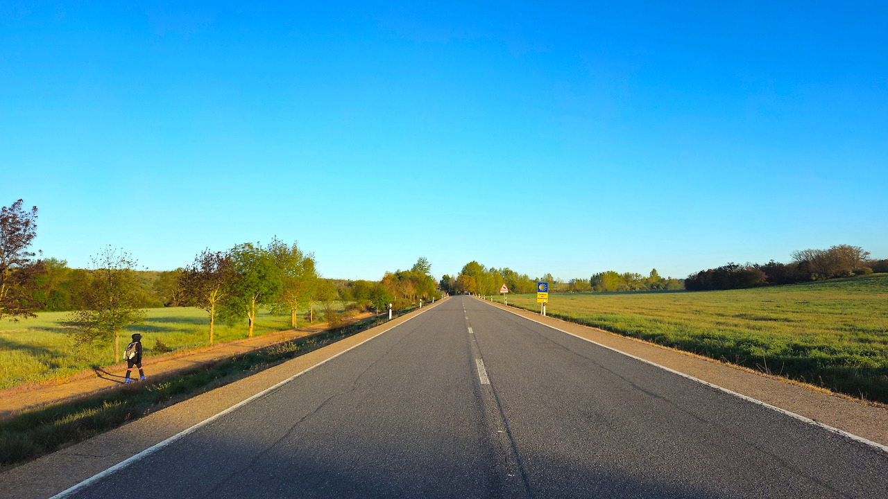 그런데 까미노에 유난히 자갈이 많아 발목에 자꾸 무리를 준다. 국도를 가만히 보니 한 시간을 걸었는데 지나가는 차는 총 3대에 불과했다. 안 되겠다. 그냥 국도 위로 올라갔다. 걷기가 훨씬 낫다. 이제 노래 부르며 가자.