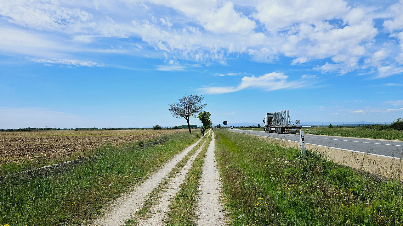 그리 크지 않은 숲을 지나자, 저 멀리 지평선 끝에 오늘의 목적지 ‘산 마르틴’이 희미하게 신기루처럼 보인다. 늘 그랬듯이 이렇게 직선으로 목적지가 보이면 너무 힘들다. 걸어도 걸어도 가까워지지 않기 때문이다. 다들 마지막 3km 여를 힘겹게 걷고 있다. 서로 말없이 눈인사만 나눈다. 말하지 않아도 무슨 말을 하는지 안다. 너무 힘들단다.