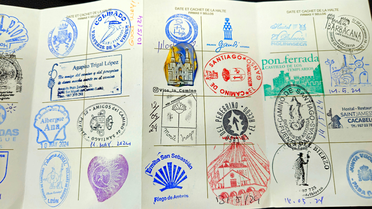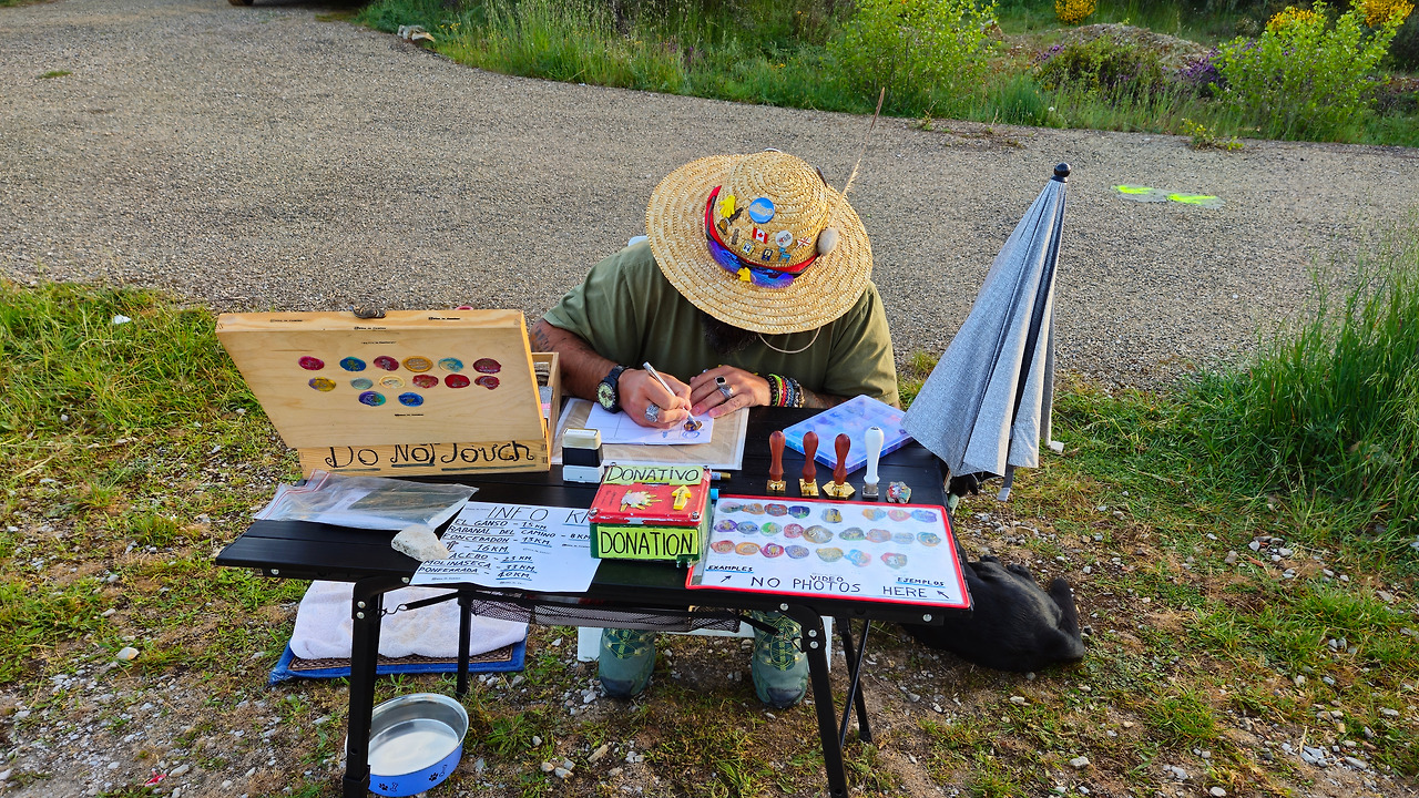 한 시간 이상 사람 없는 까미노를 혼자 걷는다. 터벅터벅 조금은 무서운 생각에 걷고 있는데 갑자기 시커먼 강아지가 달려온다. 알고 보니 왁스로 ‘세요(스탬프)’ 를 만들어 찍어주는 ‘마테오’의 강아지 5살 '타이슨'이다. 기분 좋게 기부금을 내고 왁스로 만든 스탬프를 순례자 여권 한 중앙에 받았다. 이렇게 내 순례자 여권에 찍힌 수십 개의 스탬프 중 가장 아름다운 세요가 되었다.