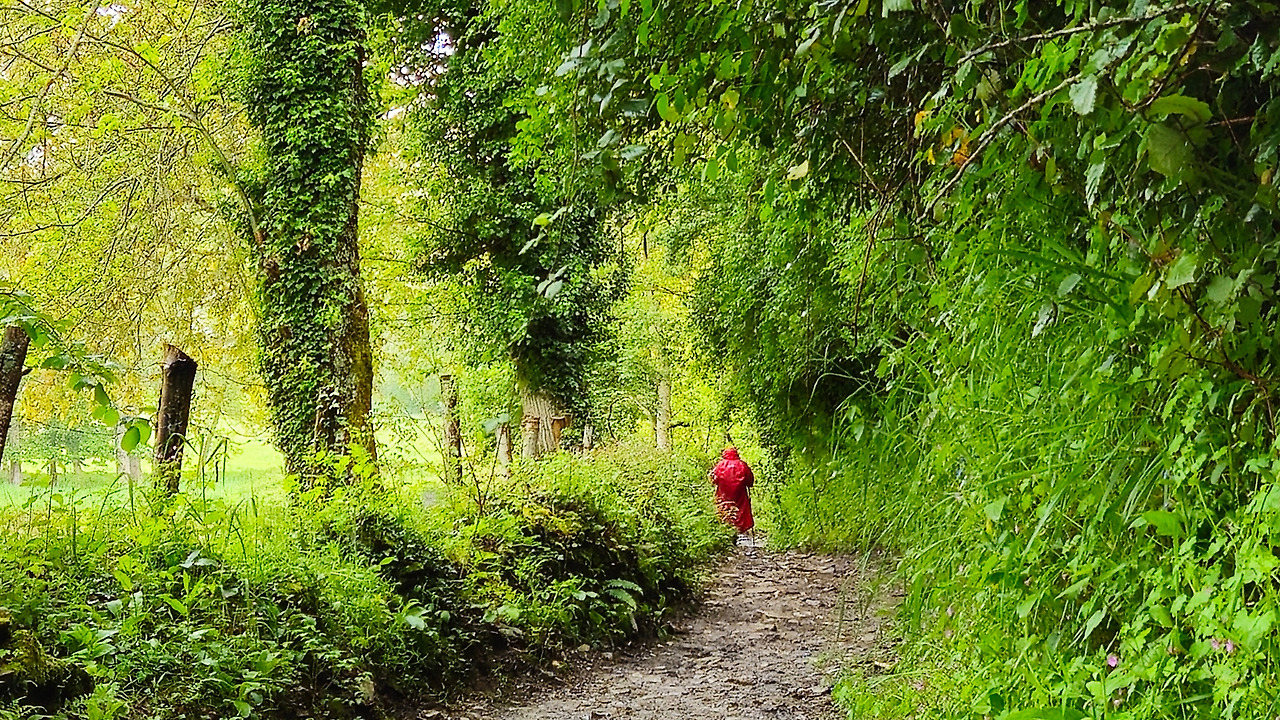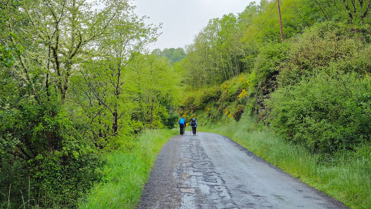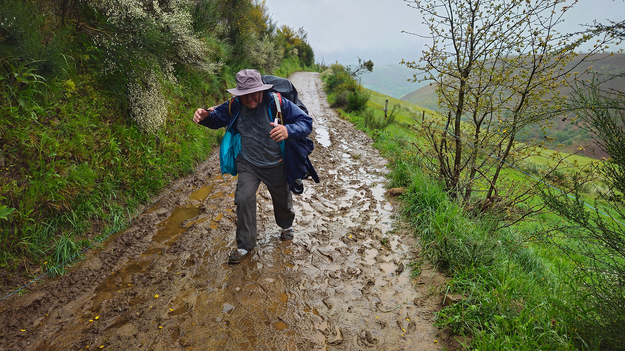 작은 도로를 따라가던 까미노는 드디어 본격적으로 산을 오르기 시작한다. 산길은 온통 물먹은 진흙 길이고, 경사도 제법 되는데 비는 점점 더 많이 온다. 오늘 아침 호텔에서 나올 때 모든 옷가지를 어제 구해 온 비닐로 한 번 싸서 배낭에 넣고, 배낭을 레인 커버로 다시 덮고, 그 위에 판초 우의로 다시 덮었다. 이 정도 했으니 배낭 안에 있는 물건들은 안전하리라. 다만 내 팔과 얼굴, 어깨와 다리는 온통 비를 맞아 제법 추위가 몰려왔다.