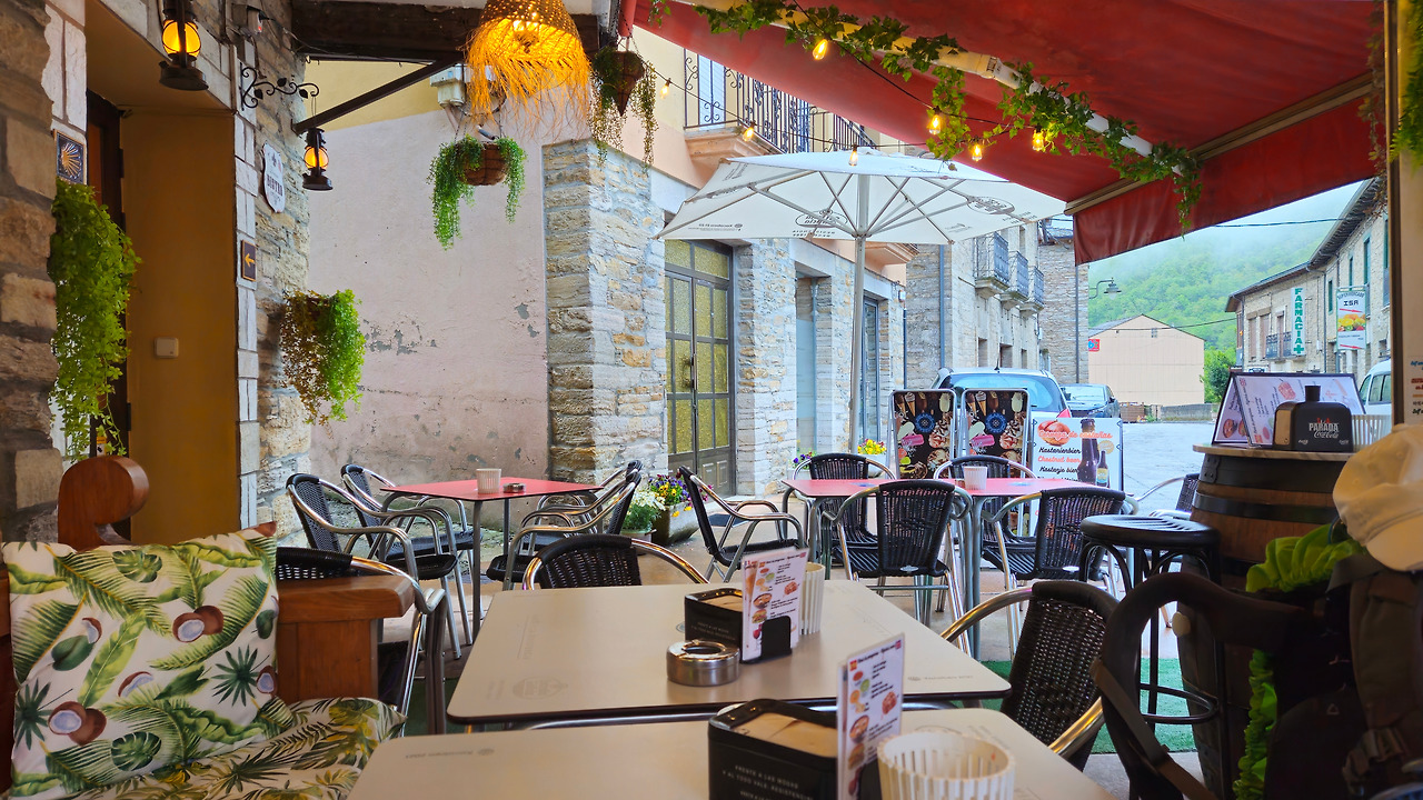 마을에 정말 작고 예쁜 카페가 하나 있었다. 벽난로에는 장작이 불타고 젊은 청년이 커피를 내리고 있다. 커피도 맛있고 삶은 계란은 허기를 채우기 딱 이었다. 나는 여기에서 옷도 말리고, 땀도 식히고 다리도 좀 쉬어 간다. 이곳에 머물다 보니 많은 순례자들이 비 맞은 모습으로 들어와 모두 벽난로로 달려간다. 이제 고도를 300m만 올리면 된다.