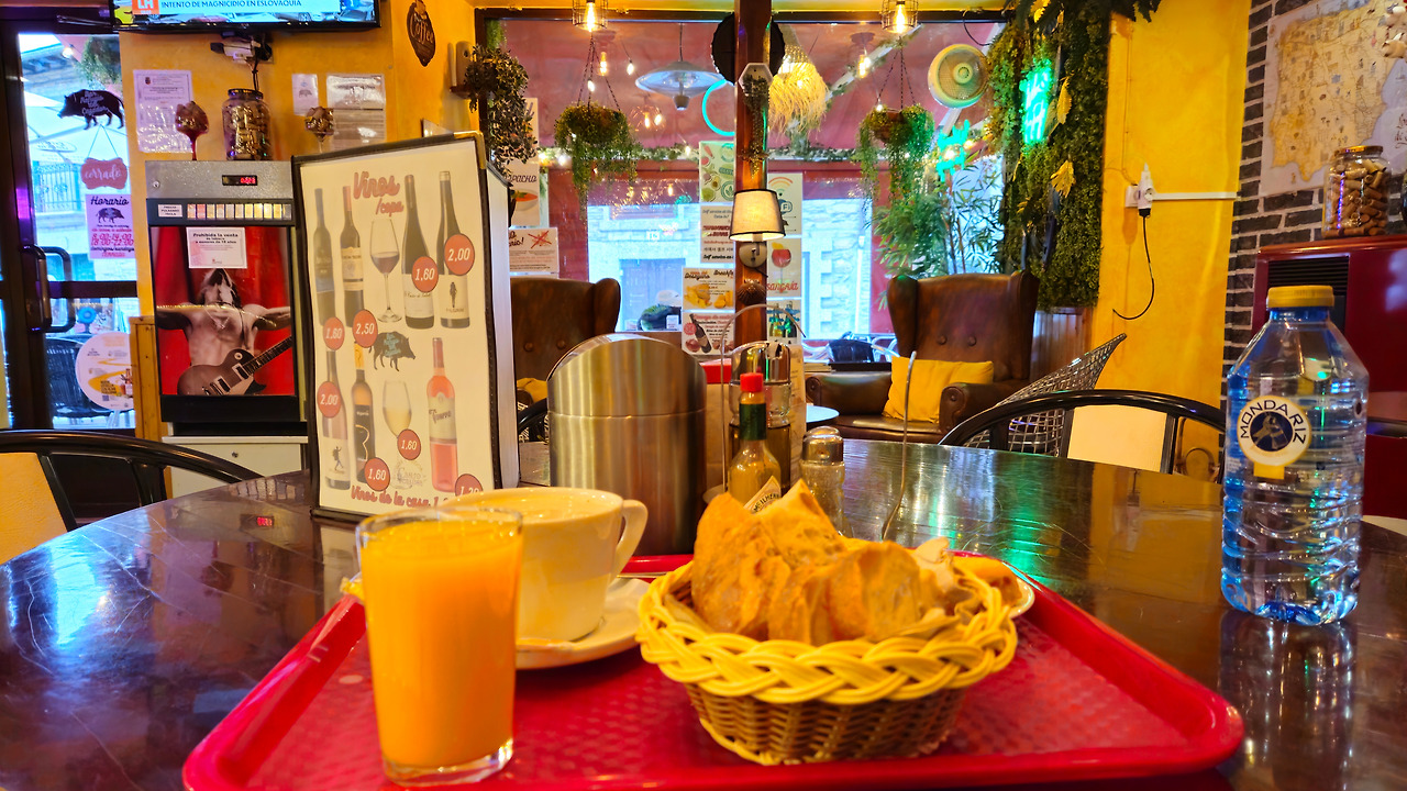 너무 이른 아침 이어서 그런가? 포기하고 다음 마을로 넘어가는데 중년 부인이 지나간다. 혹시나 하는 마음에 "저기 아래 카페는 언제 문 열지?"하고 물어보니, 자기가 그 카페 종업원인데 지금 출근 중이라고 한다. “너 따라가면 아침 좀 줄래?” 그리고 오렌지 주스와 커피, 토르티야가 내 식탁에 배달되었다. 물도 한 병 추가로 사서 배낭에 넣었다. 함께 나온 바게트 몇 조각은 휴지에 싸서 바람막이 점퍼 주머니에 넣고 출발한다.