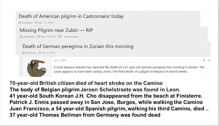매년 몇 명의 사망자가 계속해서 나오는 걸 보면 예사롭게 볼 것만은 아닌 것 같다. 나를 도와준 영국 의사 말에 의하면 이곳 사망자 대다수가 심장마비이고, 전해질 부족과 오늘 같은 급작스런 날씨 변화에 제대로 대비하지 않은 부주의가 원인이라고 하니 새겨 들어야 할 필요가 있다고 본다. 사실 순례자 무덤은 오르막에 있는 게 아니라 대부분 내리막이나 평지에 더 많았다는 점, 비교적 젊은 연령이 많다는 점에 주의 깊게 들어야 할 이야기다. 아래 신문 기사에서처럼 올해만 해도 생각보다 많은 사람이 유명을 달리하였다.