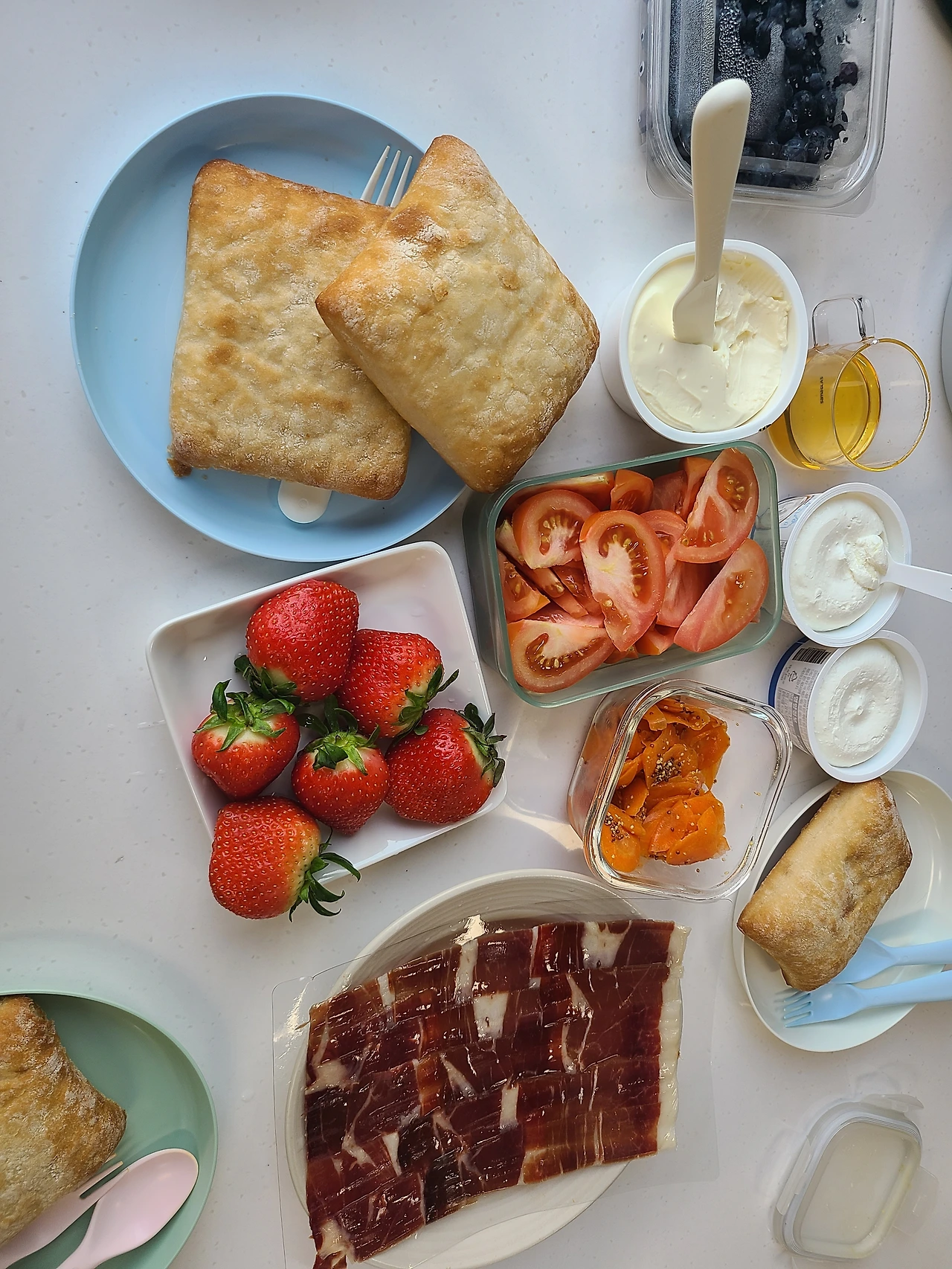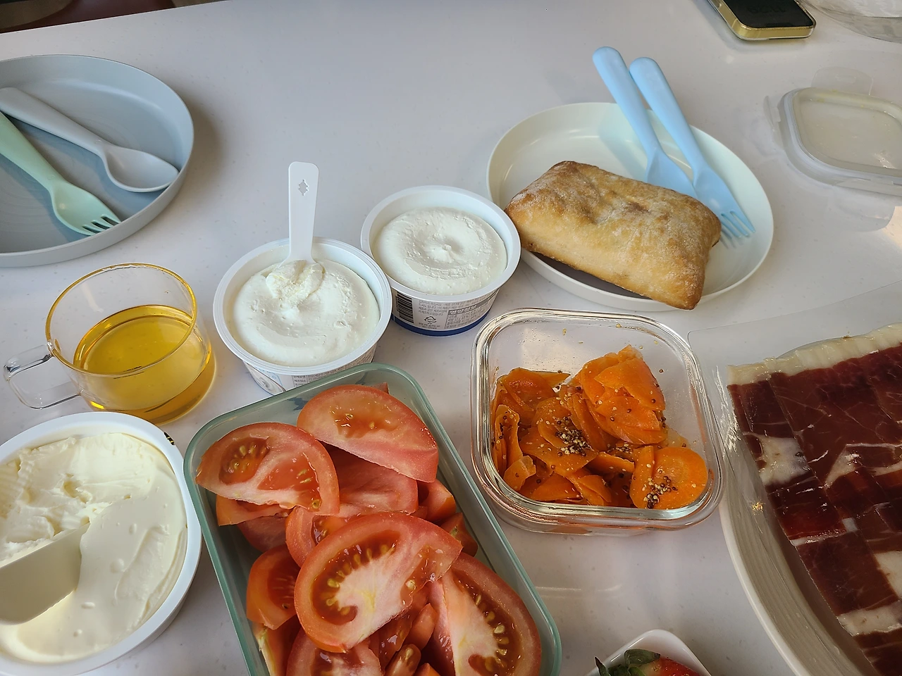 치아바타와 크림치즈, 담당님이 선물로 준 하몽, 토마토슬라이스를 챙겼다.