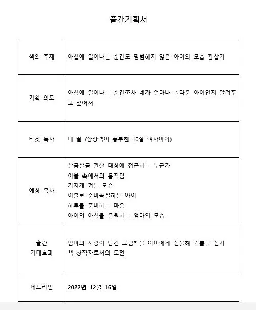 모임을 리딩하는 사람으로서 마감일보다 하루는 일찍 제출해야겠다는 생각을 했다. 하지만 끝까지 미루는 창의적이고 게으른 사람이기에, 나 또한 목요일 오후 9시에 공유했다. 부족함이 많지만 부끄럽지는 않은 나의 출간 기획서를 첨부한다.