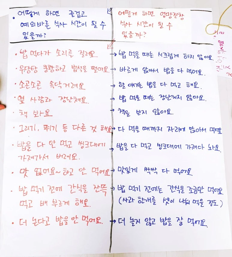 조금 전까지 아이들이 열심히 쏟아낸 "엉망진창 식사 시간 만드는 방법"을 각각 거꾸로 생각해 보는 시간입니다.