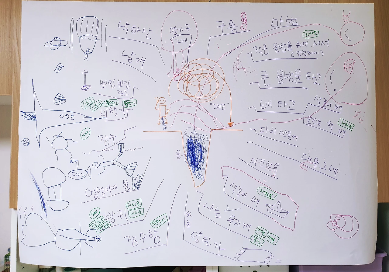 아이들의 생각의 속도는 쓰기의 속도보다 빠르기 때문에, 엄마가 쓰고 아이들이 그림 그리면 좋아요!