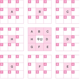 먼저 전지에 넓은 틀(가장자리)을 그리고, 가로 세로 3줄씩 선을 그어 주세요. 크게 9칸이 그려질 것입니다. 그 이후에 아이들에게는 각 줄의 가로 세로를 다시 3 등분하여 큰 1칸이 작은 9칸이 될 수 있도록 선을 그어 달라고 요청하세요.