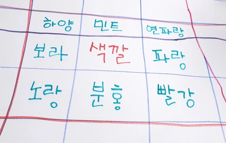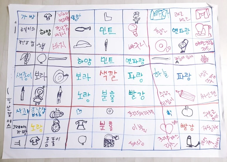 이때 색감에 예민하신 분들은 아마 아이들이 노란색을 얘기했다면 노란색 마커펜으로 '노랑'이라고 적으실 테죠. 아마 그렇게 하는 것이 더 컬러풀하고 깔끔한 산출물이 나오도록 할 겁니다. 하지만 차라리 검은색으로 '노랑', '파랑', '분홍' 등을 적어 보세요. 색깔 연상 사고 뿐 아니라 두뇌 계발 트레이닝도 함께 할 수 있습니다.