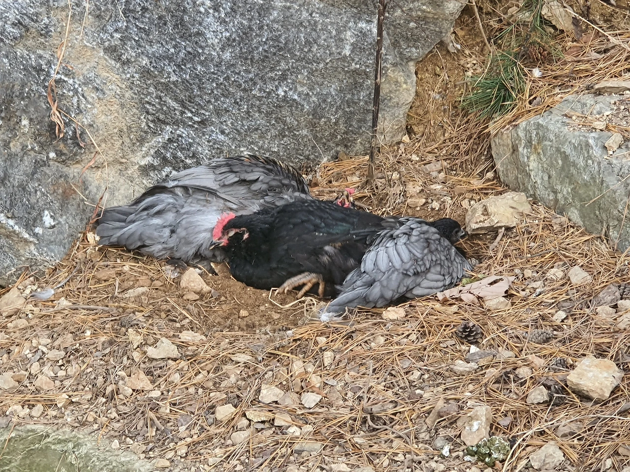 뒷산의 일부를 닭의 뒷마당으로 허용해 울타리를 쳐 줬는데 날씨가 좋은 날이면 흙 목욕을 하기도 하고 나름의 운동을 하기도 한다. 자기들끼리 서열싸움을 한다고 머리털을 삐쭉 세우기도 하고 옆 눈으로 레이저 쏘며 한 바퀴 돌기도 한다. 물 한 번 호로록 먹고 목으로 넘기기 위해 하늘 한 번 쳐다보는 것도 마냥 귀엽다. 맨땅을 휙휙 파내어 흙을 먹는 건지 벌레를 먹는 건지. 그러다 배부르면 횃대에 올라가 꾸벅꾸벅 졸기도 한다.