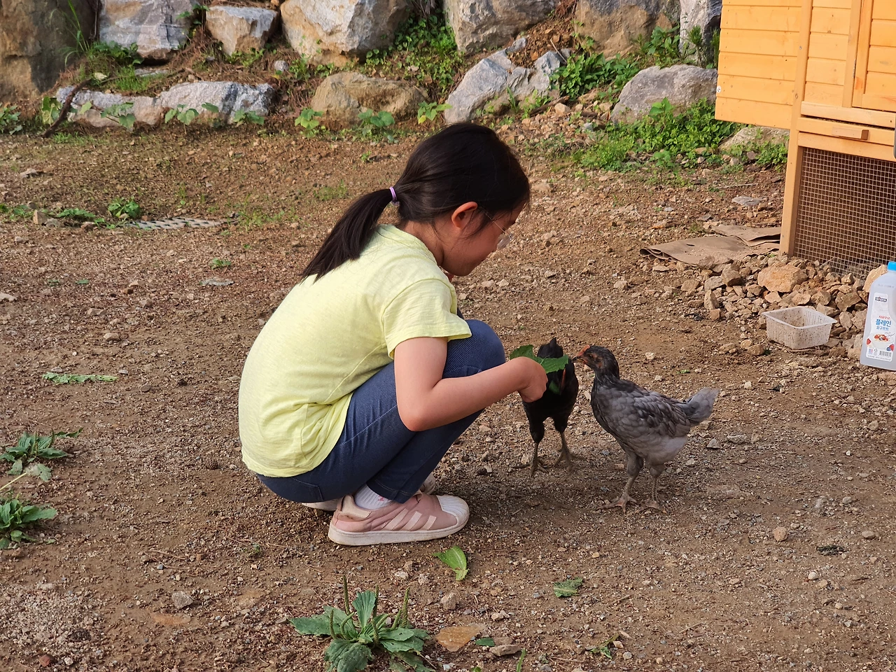 그 생활에서 슬며시 만져보기도 하고 풀도 뜯어다 주고 내가 너의 언니 혹은 누나라며 챙겨주기도 한다. 무서워하지 않는다는 것이 가장 큰 수확이다. 밖에 나가기 싫어하는 집콕러들이지만 꼬꼬들한테 먹이 주고 오자 하고 꼬시면 밖으로 나가는 것이 두 번째 수확이다. 지금은 시도 때도 없이 닭을 흉내 내고 자기가 부르면 꼬꼬가 대답한다고 자꾸 암탉과 대화를 시도한다. 그 자체가 재미있는 일상이 되는 이 세 번째 수확이다.