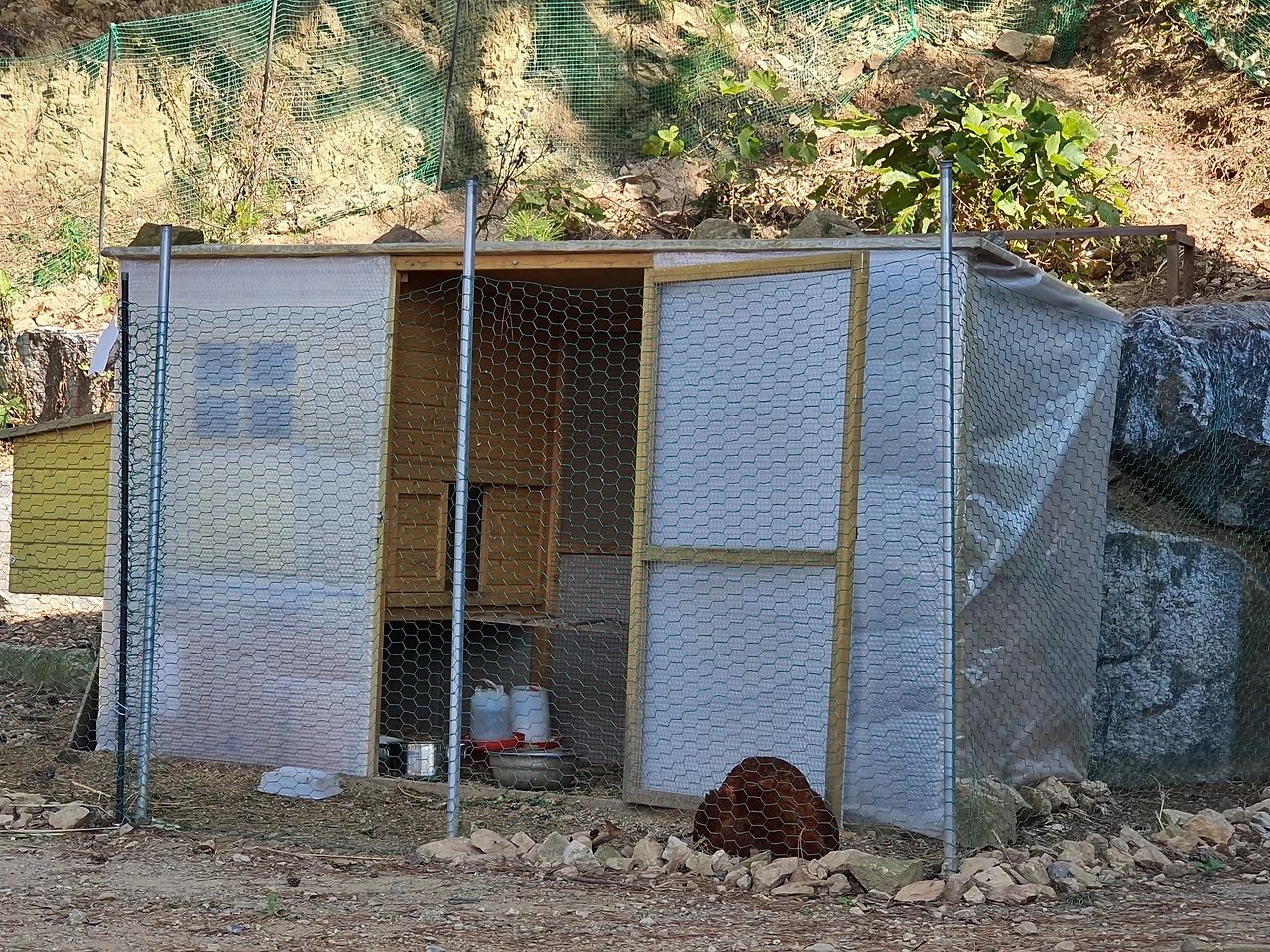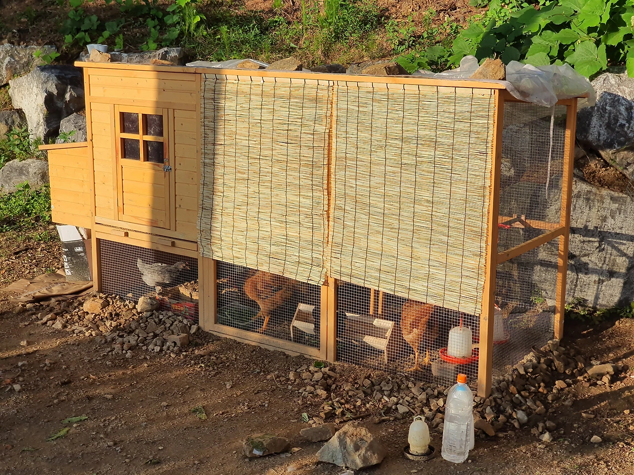 계절마다 해 줘야 하는 관리도 엄청난데 거의 매주 보수작업에 들어갔다. 여름에는 서향의 햇빛에 닭들이 너무 더울 것 같다고 하니 사이즈에 맞춰 차양발을 주문해 달아 주었다. 장마철엔 닭장 안으로 비가 들이칠 것 같다고 하니 큰 장막 비닐로 옆면과 뒷면을 가려 주었다. 심지어 올리고 내릴 수 있는 시스템으로.