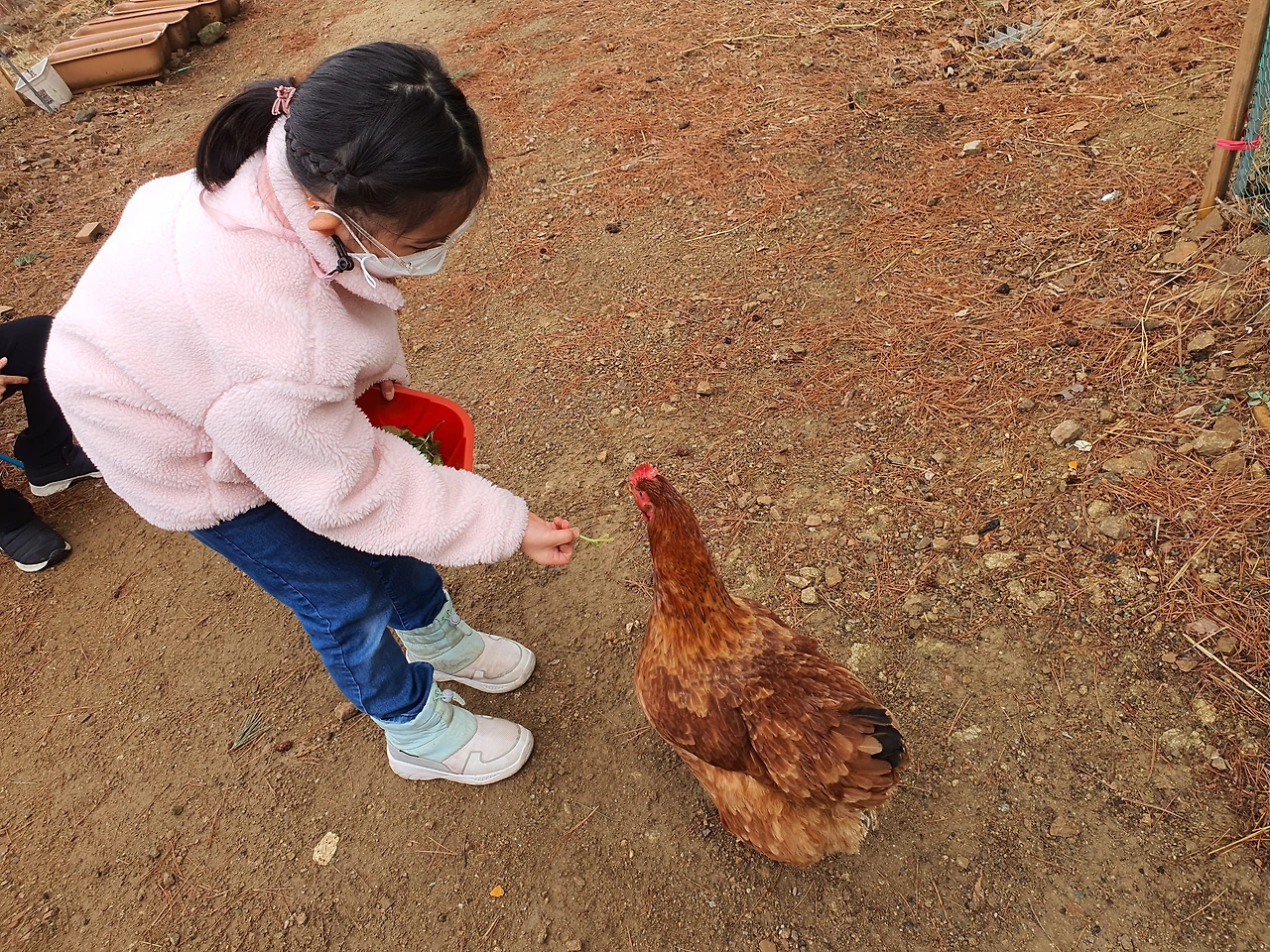 오늘은 볼 것 없는 흙바닥과 널브러진 낙엽들 사이로 언뜻 비친 초록색의 무언가를 눈여겨봤다. 썩어가는 낙엽들을 기꺼이 손으로 헤치고 용기 있게 땅을 뚫고 얼굴을 내민 이름 모를 풀에게 관심을 가졌다. 그리고 그 존재로 봄을 느꼈다. 그리고 우리의 사랑스러운 암탉 큐티에게 그 봄을 바쳤다.