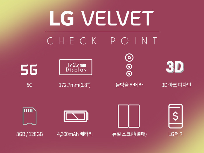 최신 스마트폰답게 LG 벨벳은 5G 이동통신을 지원하는 퀄컴 스냅드래곤 765를 탑재하고 8GB 램, 128GB 내장 메모리를 제공합니다. 128GB 단일 용량은 최대 2TB의 외장 메모리를 지원하므로 저장 공간에 대한 아쉬움은 해소 가능합니다. 또한 4096 필압을 지원하는 스타일러스 펜과 듀얼 스크린까지 차세대 플래그십의 면모를 그대로 보여줍니다.