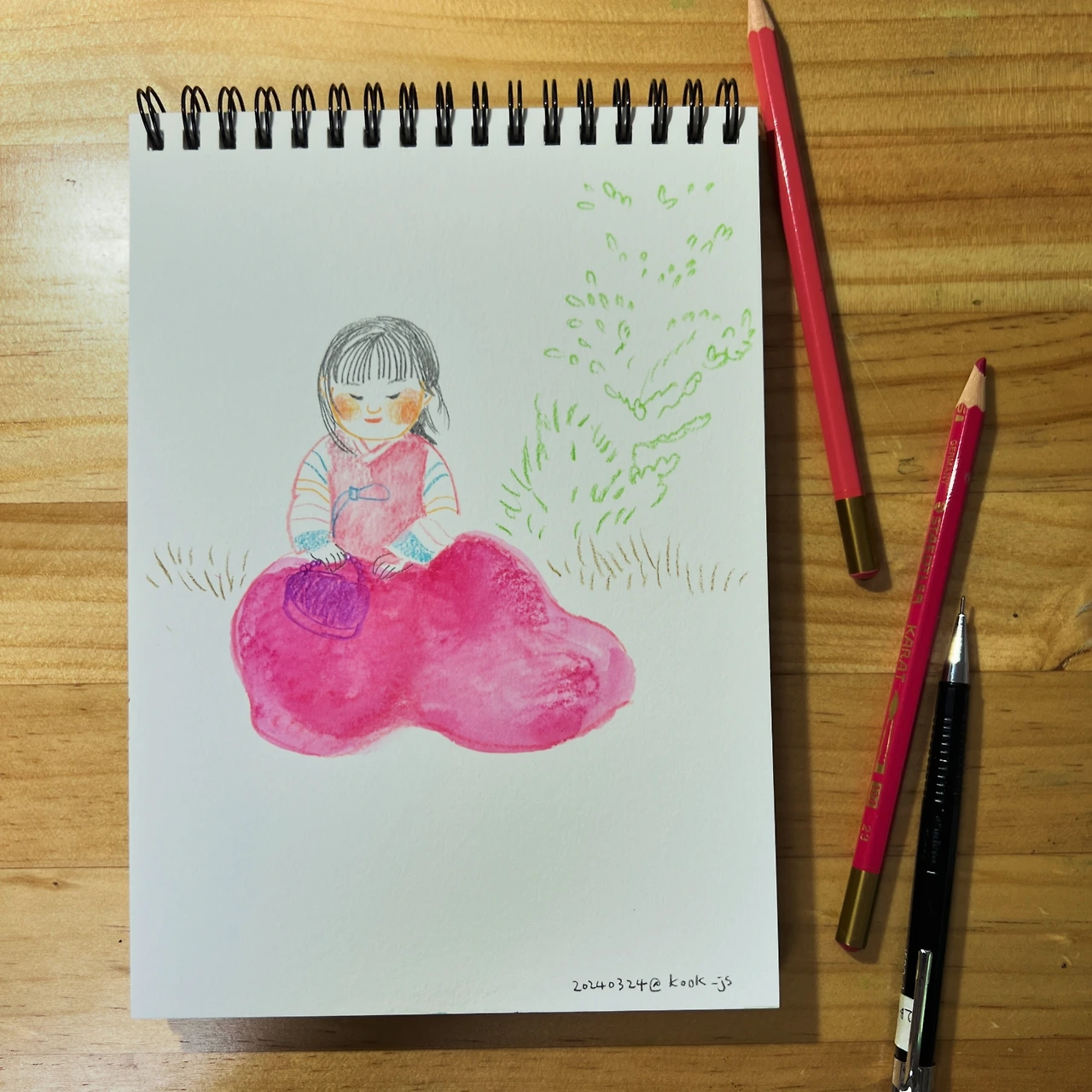 새로운 컨텐츠를 기획하고 만든게 아니라 그저 오래 해오던 일이 책이 된 것이었기에, 저는 저를 ‘제작자’로 생각해볼 겨를이 없었습니다. 기분이 이상했어요. 몇 년 동안 꾸준히 그리고 업로드하던 것을, 그저 간단히 엮어 내놓았을 뿐이었거든요. 늘 하던대로 하고 있었는데 갑자기 사람들이 ‘독립출판도 하는 작가’, ‘다양한 활동을 하는 그림책 작가’ 라고 부르기 시작했습니다. 북토크 형식의 작가와의 만남이 아니라 ‘그림책 작가와 함께하는 드로잉 클래스’ 도 하게 되었습니다. 기대는 커녕 예상하지도 못했던 일들이었어요. 저는 달라진 게 하나도 없는데, 그저 ‘꺼내놓은’ 것 뿐인데 조금 달라졌습니다. 그걸 깨달으니 후회가 앞섰습니다. 그동안 혼자 방에서 꼬물꼬물 무언가를 해왔지만 적당한 기회가 없다며 포기한 일이 한 두 가지가 아니었는데, 조금 더 용기를 낼 걸 그랬다고요. 하지만 아마도 이 작은 변화도 그동안의 연습이 쌓아준 결과일 겁니다. 이 자그마한 드로잉북 하나만큼요.