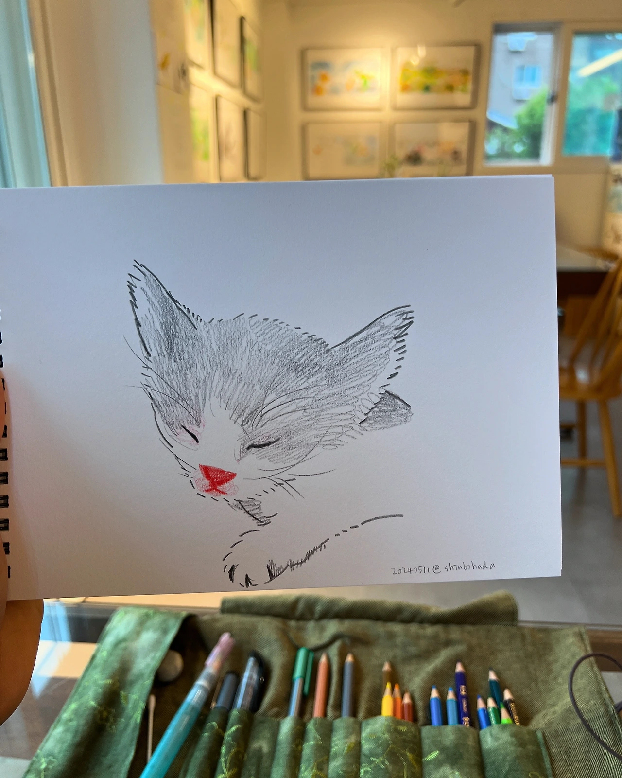 이 그림은 오래 응원해주신 독자분의 사진을 보며 그렸습니다. 전날, 그러니까 금요일 저녁 라방에서 ‘인스타그램에서 드로잉할 사진을 어떻게 고르냐’ 는 질문에, ’그림으로 그려도 좋아할 사람인지 모르니 어필을 해달라‘고 했거든요. 라방이 끝난 후에 아기 고양이 사진을 올리며 ‘이것은 어필’ 이라는 태그를 달아주신걸 봤기 때문이에요. 귀여운 아기 고양이를 구조해서 건강하게 길러낸 사진과 사연까지 있었고요. 그러니 어찌 그냥 지나칠 수 있겠어요? 전시장 나올 준비를 하며 드로잉할 짬이 없었지만 드로잉북을 챙겨 나와서 그리고야 말았습니다. 번거롭지만 특별한 시간입니다. 이렇게 또, 소박한 추억이 남게 되었어요.