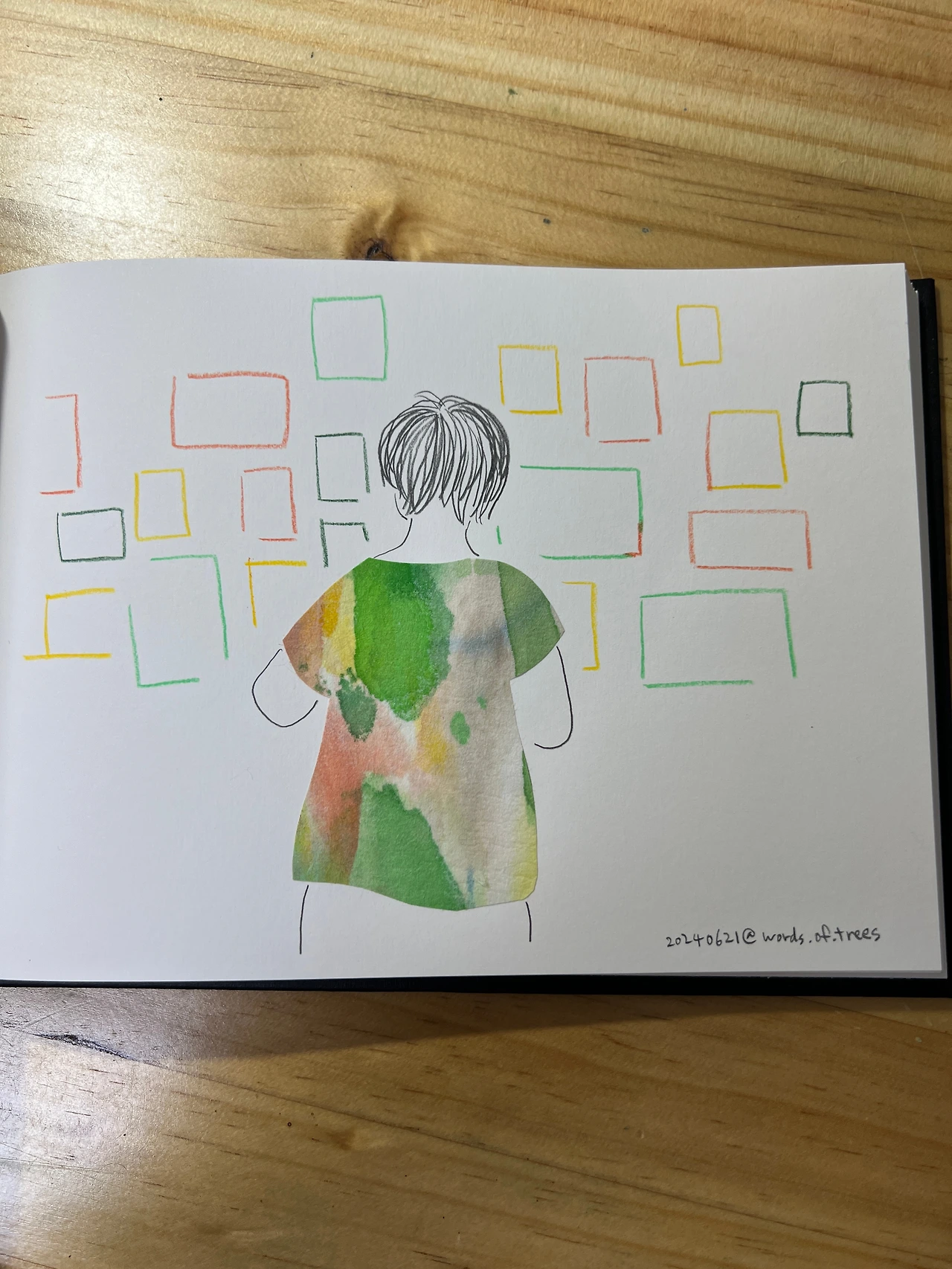 이번주는 아주 분주하게 보냈습니다. 금요일은 전시 첫 날이라 정신없이 하루를 보내느라 매일 드로잉을 건너뛸까 했는데요, 귀가해서 정리하는 타이밍에 올려주신 사진을 보고 얼른 그렸습니다. 이 장면은 전날 전시실에 그림을 디스플레이하는 제 뒷모습이거든요. 그래서 오랜만에 자화상을 그렸습니다.