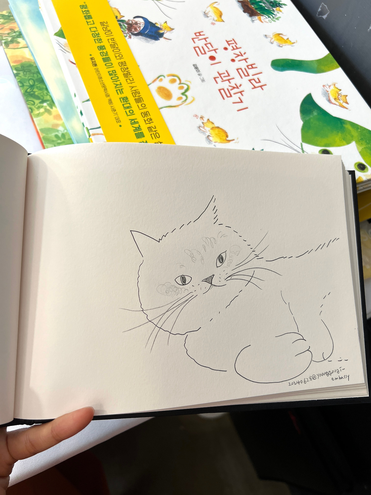 이 드로잉 속의 고양이는 저의 고양이 뮤즈, 영국이의 동생같은 존재에요. 혈연은 모르겠지만 한가족이어서 비슷하게 느껴지는 것 같기도 해요. 물론 각각 다른 존재이고 다른 개성의 소유자입니다만. 오랜만에 이 아이를 그리고 전시장에 앉아있자니 첫 고양이 뮤즈의 기억이 떠올라 마음이 뭉클했습니다. 몇 년 전에 고양이 그림을 그리도록 시작을 이끌어준 영국이, 덕분에 지금은 귀여운 고양이를 꽤 잘 그리게 되었어요. 이렇게 그림책까지 냈고요. 고마워요, 나의 뮤즈.