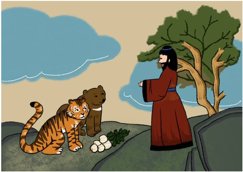 이때에 곰 한 마리 범 한 마리가 같은 굴속에서 살고 있었는데, 항상 환웅에게 빌어 사람이 되기를 원했다. 이때 환웅이 신령스러운 쑥 한 줌과 마늘 20개를 주며 말하기를, "너희가 이것을 먹고 백일 동안 햇빛을 보지 않으면 곧 사람이 될 것이라"고 했다. 곰과 범이 이것을 받아먹고 삼칠일 동안 조심하였더니, 곰은 여자의 몸을 얻었으나 호랑이는 조심하지 못하여 사람의 몸을 얻지 못했다.