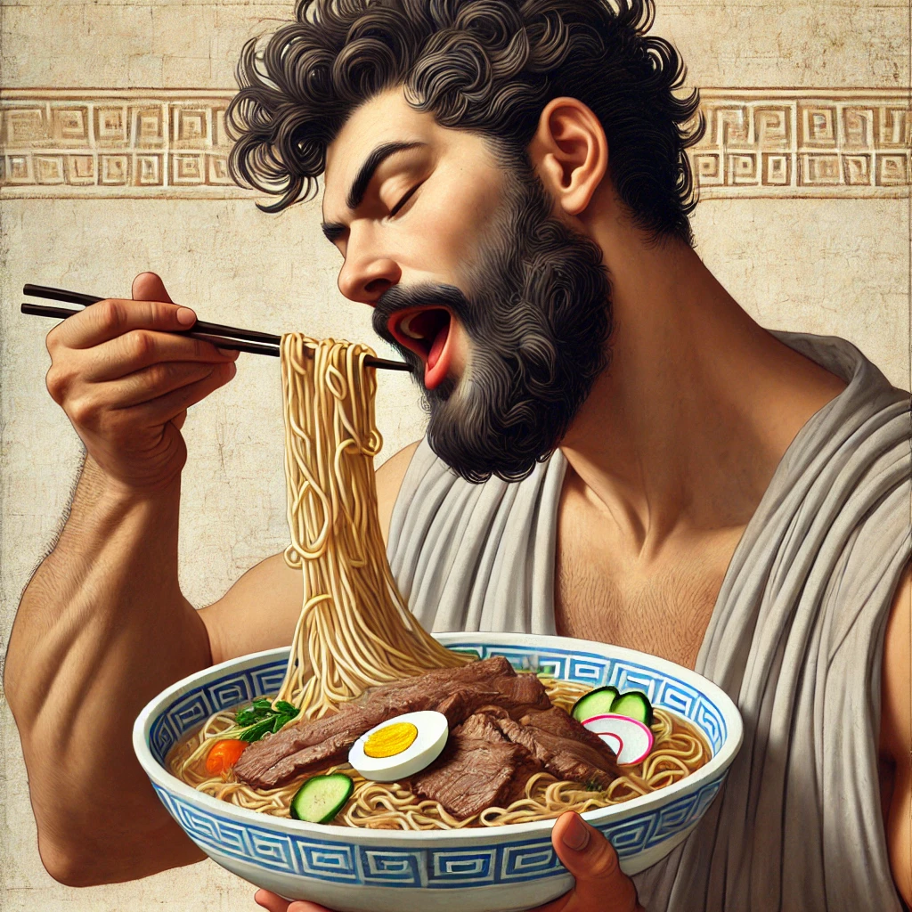ChatGPT에게 평양냉면 먹는 남자를 고전주의 화풍으로 그려달라고 해 보았다. 결과적으로 그리스 남자가 평양냉면을 먹게 되었다. 다소 충격적이지만 묘하게 마음에 드는 결과물이다.