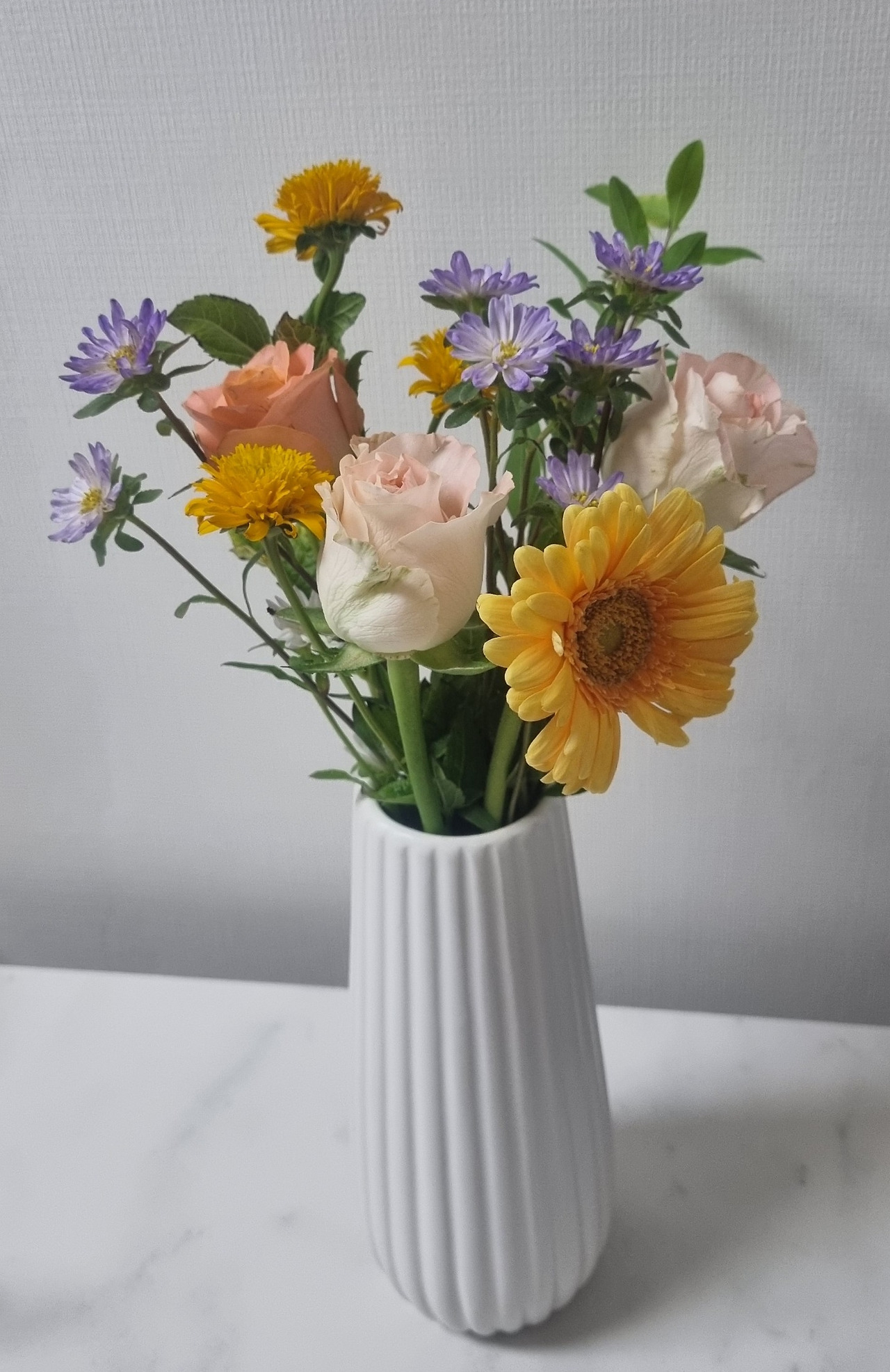 집에 오자 아내는 엉성한 꽃다발을 풀어 꽃병에 꽃을 옮겨 담았다. 꽃병에 담기니 꽤 달라 보였다. 그렇게 2년이 되었다.