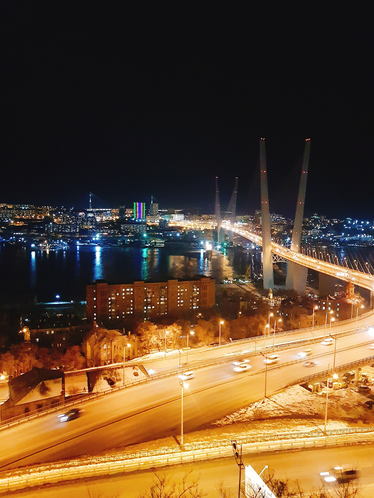 블라디보스톡과 루스키섬을 잇는 금각교를 중심으로, 야경이 참 아름다웠다. 다만 추운 날 사방이 뻥 뚫린 높은 곳에 올랐으니 더욱 추웠고, 기념품샵이었을 것으로 추정되는 곳은 일찌감치 문을 닫은 후였다. 러시아 연인들은 더 깊숙한 어둠 속으로 사라졌고, 올라오니 드문드문 사람들이, 사랑으로 추위를 잊은 연인들이 보였다. 그때, 휴대폰이 겨우 전원이 돌아왔다. 급하게 사진을 찍었다. 그렇게 가까스로 사진을 남길 수가 있었다.
