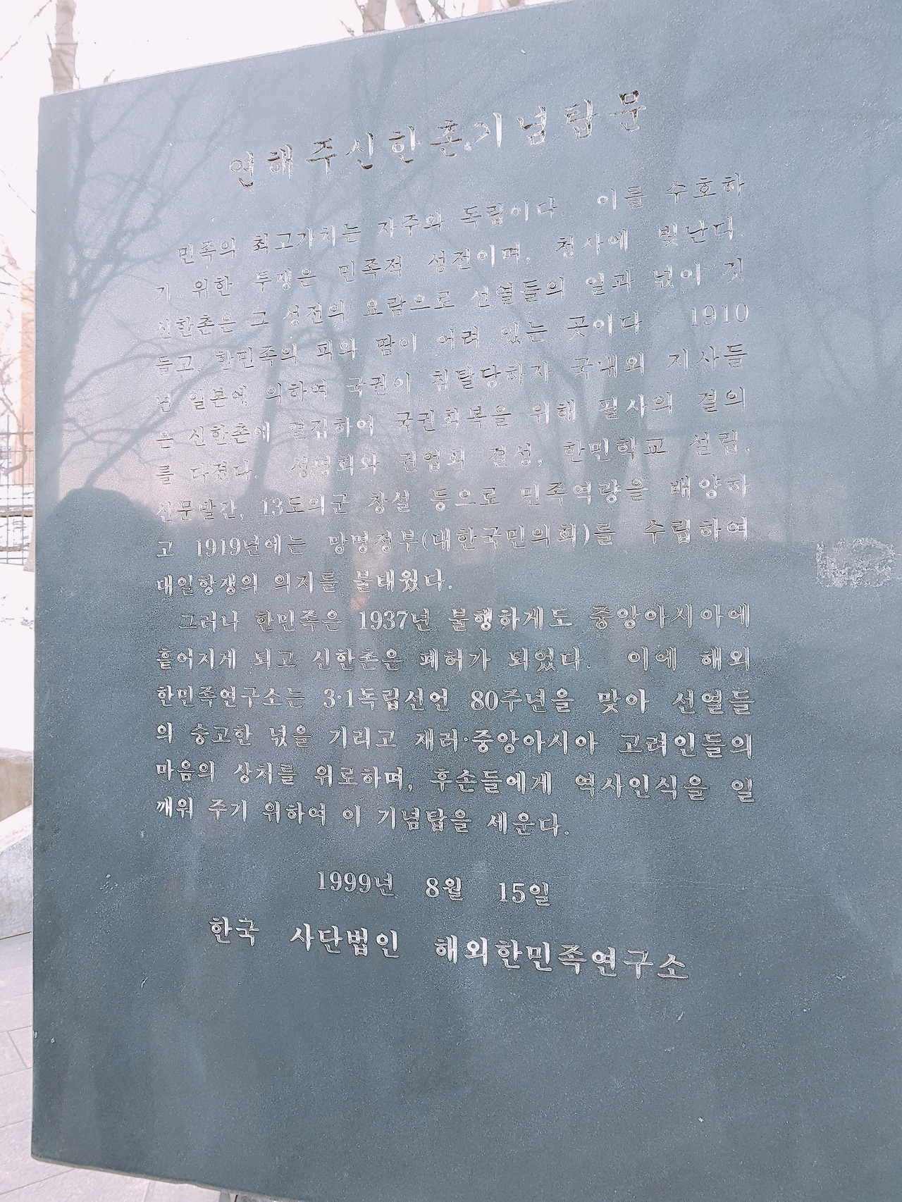 그러나 한민족은 1937년 불행하게도 중앙아시아에 흩어지게 되고 신한촌은 폐허가 되었다. 이에 해외한민족연구소는 3.1 독립선언 80주년을 맞아 선열들의 숭고한 넋을 기리고 재러/중앙아시아 고려인들의 마음의 상처를 위로하며, 후손들에게 역사인식을 일깨워 주기 위하여 이 기념탑을 세운다.