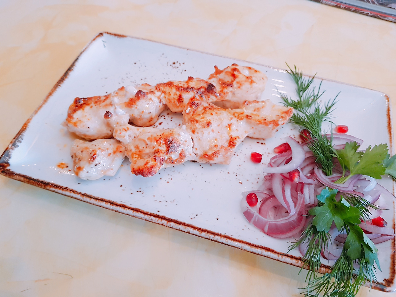 보르쉬를 떠먹고 있는데 이어 샤슐릭이 나왔다. 하얀 것이 닭고기였다. 종업원이 꼬치를 빼기 전에 사진을 찍을 수 있도록 배려해 주었다. 샤슐릭은 러시아의 전통 음식은 아니다. 본래 중앙아시아의 유목 민족들이 먹던 것이 새로운 정복자인 러시아 제국에 전파되어 지금까지 이어지고 있는 경우인 것이었다. 덩이가 큰 고기를 양념하고 숙성하여 긴 쇠꼬챙이에 꿰어 구운 것이라 쫄깃하면서도 부드러운 고기의 식감을 실컷 느낄 수 있었다. 고기 요리가 입맛에 안 맞을 리 없었고, 욕심을 내자면 얼마든지 더 먹을 수 있었으나 4개의 꼬치를 다 먹고 나자 충분히 배가 불렀다.
