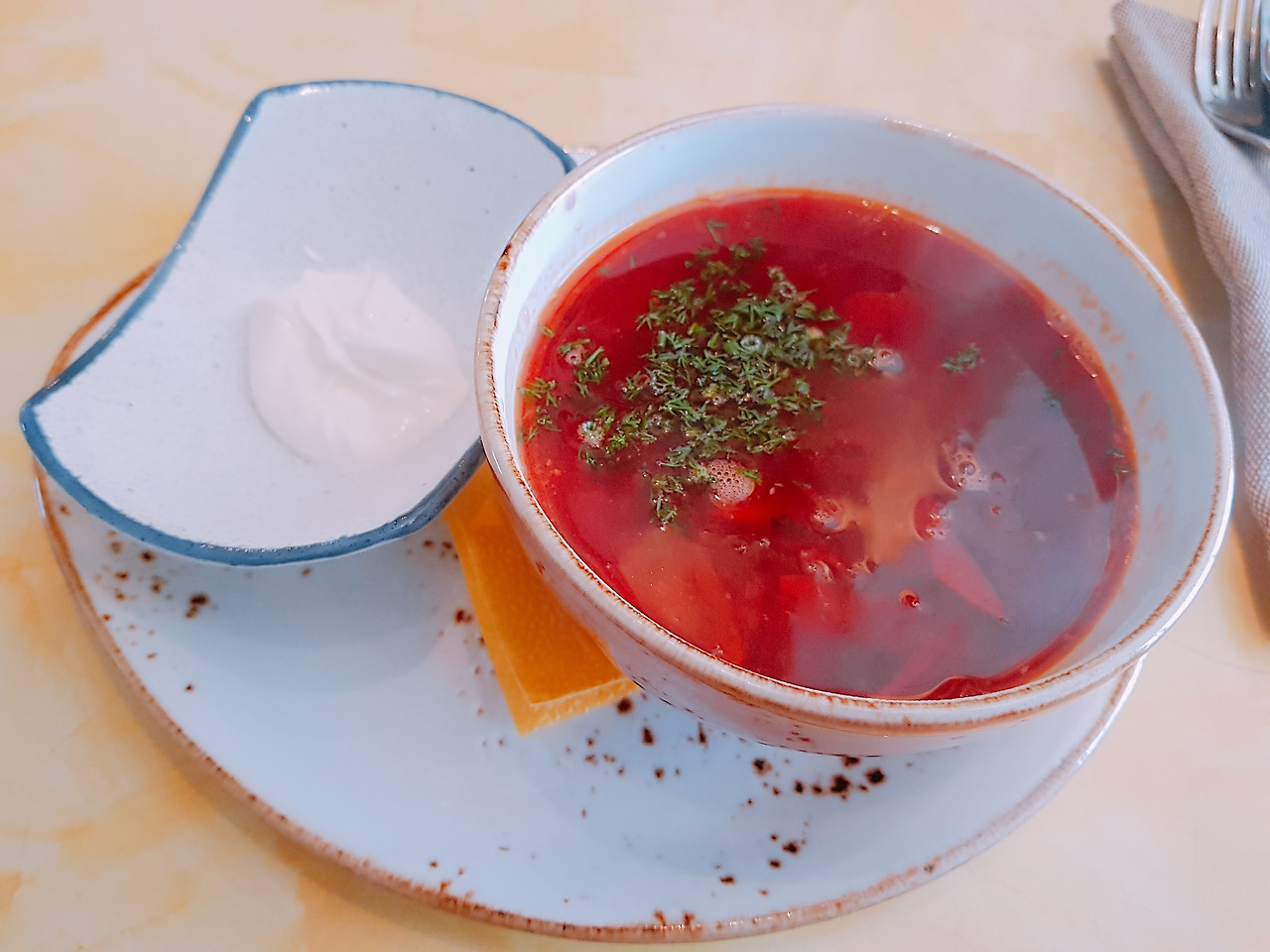 보르쉬가 먼저 나왔다. 동유럽 어느 나라에 가도 흔히 볼 수 있는 이 수프는 우리나라로 치자면 김치찌개만큼 흔한 가정식인데, 고급 연회에도 빠지지 않고 등장하는 음식이라고 한다. 특징은 붉은색의 국물. 보기에는 매콤해야 할 것만 같은데, 실은 고기 육수에 붉은색의 비트를 넣어 만든 것이라 새콤한 맛이 났다. 소고기 뭇국의 국물을 먹는 것도 같고, 토마토 수프를 먹는 것도 같은 이색적인 맛에 자꾸 손이 갔다. 하얀 샤워 크림(스메타나라고 한다)을 넣어 먹으라고 하였는데, 국물에 크림을 탄다는 것에 딱히 용기가 나지 않아(...) 일부분에 조금만 풀어 맛을 보고는 더는 넣지 않고 마저 먹었다.