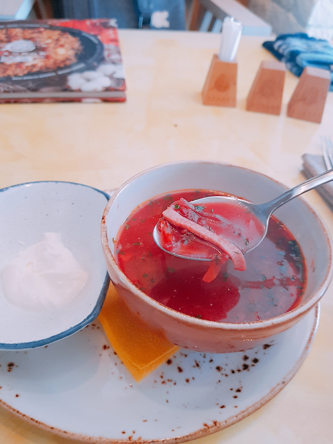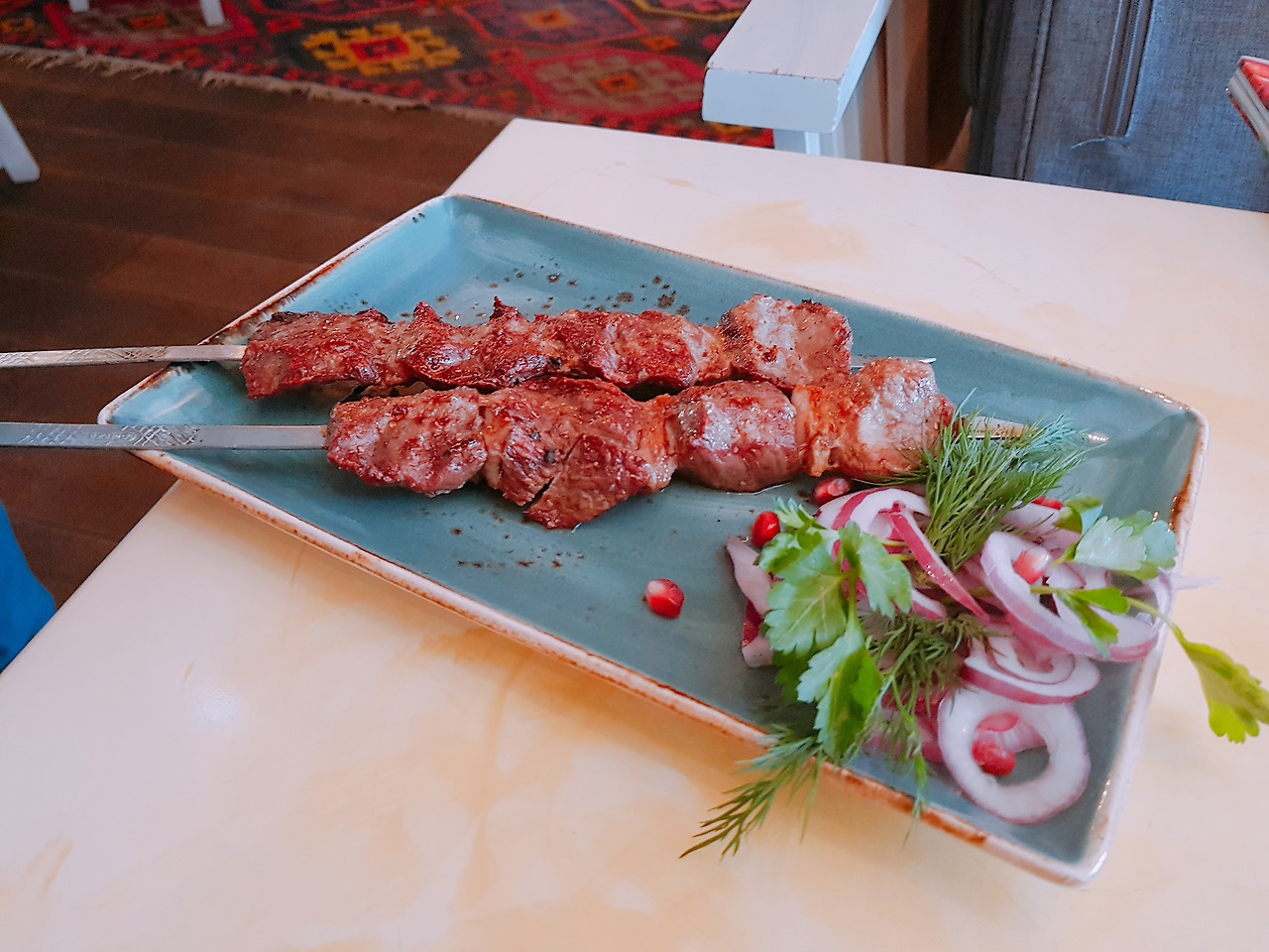 찾기 어려웠던 입구와 달리 매장 내부는 퍽 깨끗하고 넓었다. 도착한 것이 오전 11시로, 이른 점심시간이었기 때문에 음식점에는 사람이 없었다. 메뉴판을 슥슥 넘겨 크게 망설이지 않고 보르쉬와 샤슐릭을 주문하였다. 양고기는 자신이 없어, 샤슐릭은 닭고기와 소고기로 선택하였다.