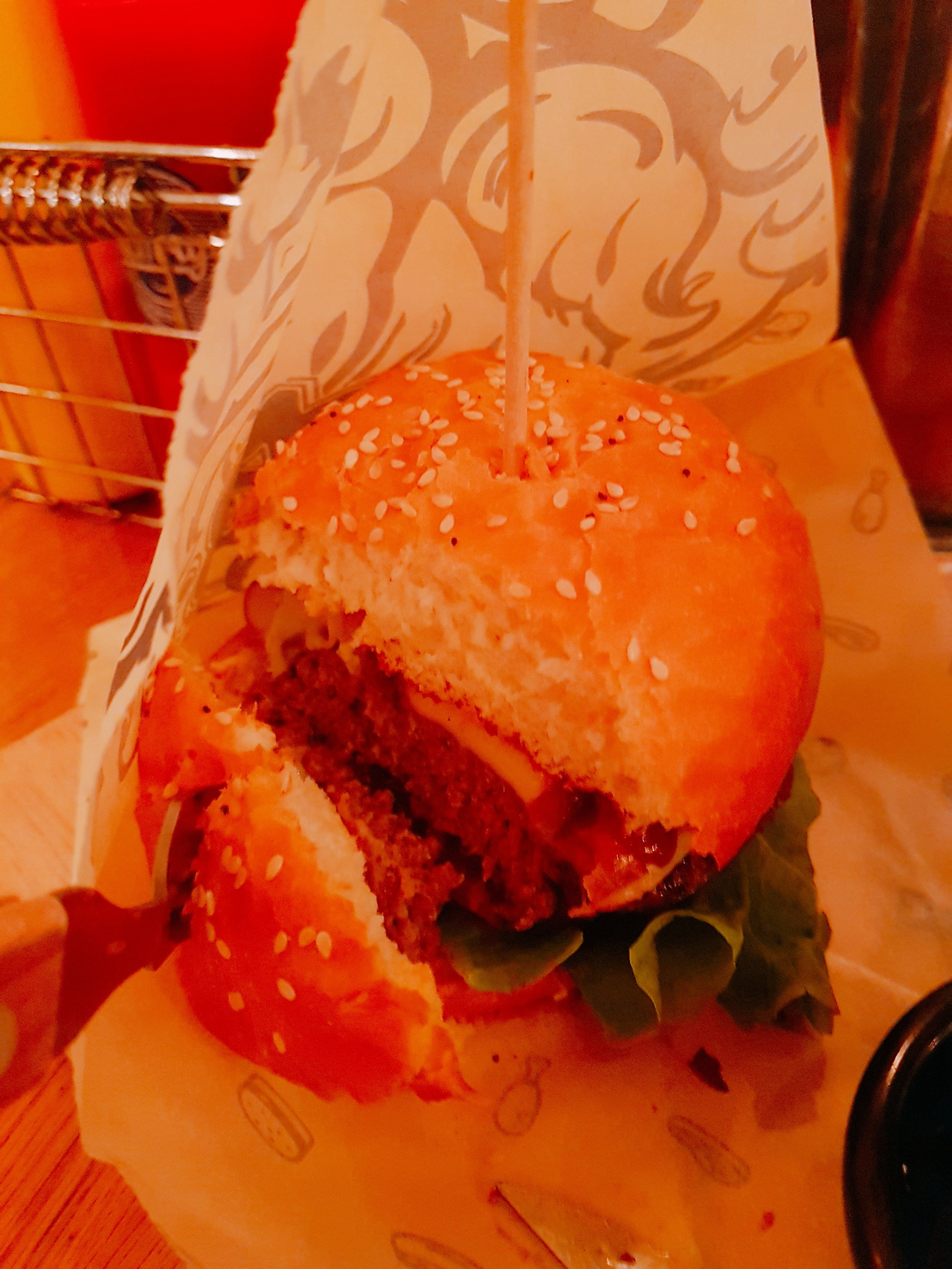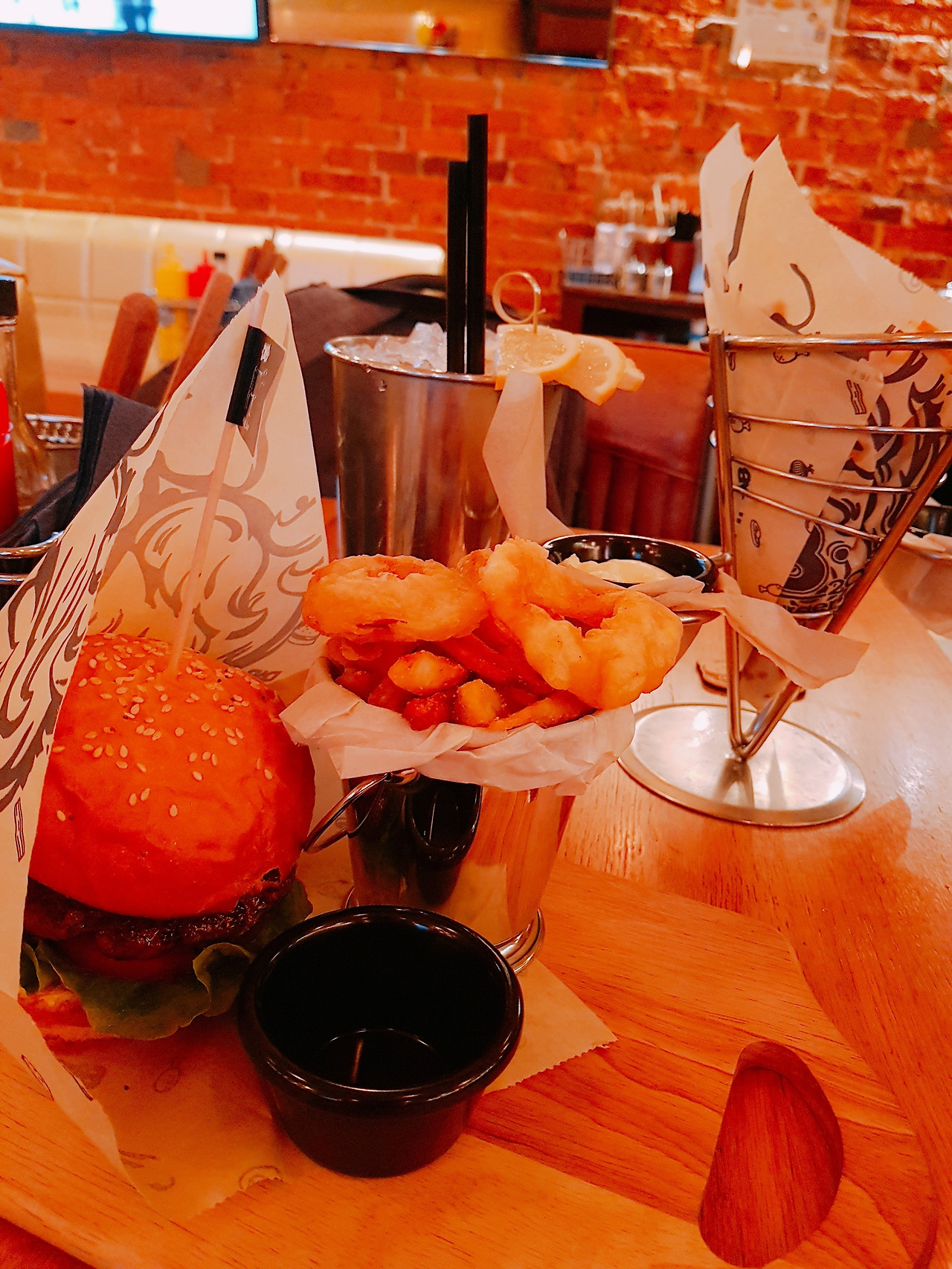 가장 대표적인 버거를 하나 시키고, 음료로는 레모네이드를 주문하였다. 음료를 따로 묻기에 세트메뉴는 없는 줄로 알고 감자튀김을 추가하였는데, 나중에 나온 음식을 보니까 고깔에 담긴 감자튀김과 함께 커다란 튀김 그릇 하나가 더 나왔다.