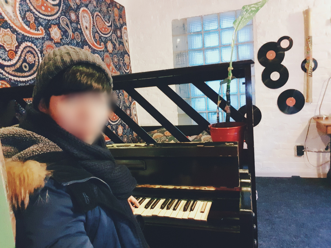 인테리어 피아노 앞에서. 건반은 고정되어 눌리지 않는다.