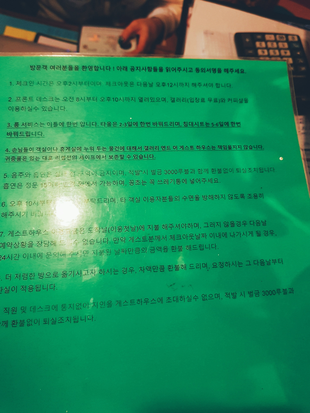 직원은 열쇠와 함께 어색함 없는 한글 문장으로 표기된 녹색 종이를 내밀었다. 게스트 하우스의 이용 수칙으로, 같은 내용이 영문으로 적혀 숙소 한쪽 벽면에도 붙어 있었다. 그 내용은 다음과 같았다.