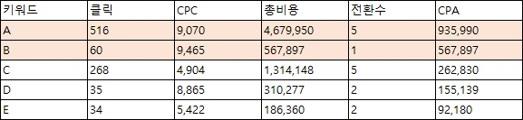하지만 이 과정에서 우리가 주목해야하는 데이터는 키워드별 CPA 값입니다. 이 업체의 기준 CPA가 300,000원이라고 가정한다면 우선적으로 운영을 고려해봐야 할 키워드는 A, B 키워드입니다.