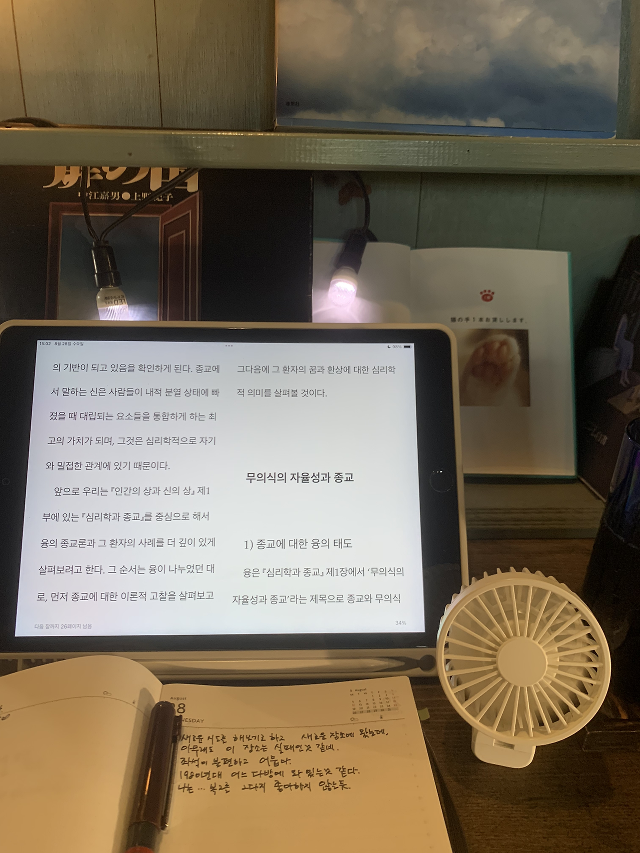 입구에서 조금 기다렸다가 자리를 안내받았다. 자그만 어항을 바라보며 독서와 사색이 가능한 멋진 자리를 예상했건만 벽을 마주하는 엄청나게 좁은 구석진 자리였고, 바로 옆에는 학창 시절 콩나물 교실의 짝꿍처럼 착 붙어 앉은 자리에 한 여인이 미동 없이 책을 읽고 있었다. 한눈에도 낡고 오래되어 보이는 의자에 조심조심 앉는데, 엉덩이를 붙이는 순간 의자가 기우뚱해져 깜짝 놀랐다. 푹신하기는 했으나 자세를 좀 고칠라치면 기우뚱해지는 통에 줄곧 정자세를 취하고 있어야만 했다. 종업원이 물 한잔을 갖다 준 후로 나를 잊은 듯 아무런 대응이 없어서 손 선풍기로 더위를 식히고 있는데 문득 고대 유물 같은 메뉴북이 눈에 들어왔다. 펼쳐보니 메뉴가 적혀 있고 안내글에 ‘천천히 음료를 골라주세요. 손님께서 말씀해 주시면 종업원이 대응하겠습니다’라고 쓰여 있다. 서둘러 종업원을 부르고 아이스커피를 주문했다. 카페 안의 모두가 조용히 종이책을 펼쳐 읽고 있는 와중에 나는 아이스커피를 마시며 태블릿으로 칼 융의 책 <심리학과 종교>의 해설서를 읽었다. 1980년대 어느 다방에 실수로 앉아 있는 기분으로 역시 복고는 내 취향이 아닌가 봐, 이렇게 어두운데 사람들은 책을 펼치고 잘도 읽고 있네… 등의 자잘한 투정을 잠시 하고 있었다.