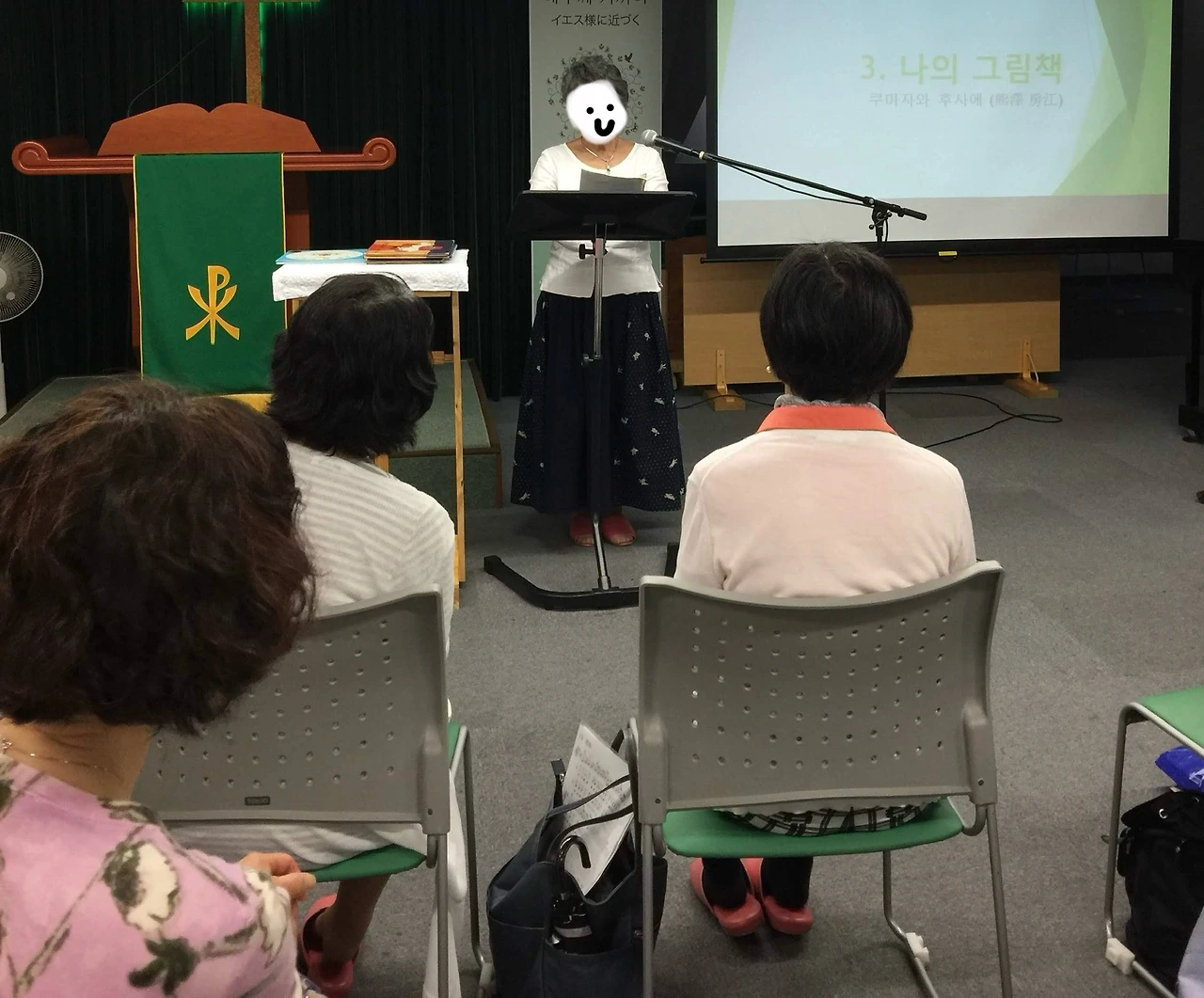 한국어 교실에서는 상반기의 종강일에는 늘 발표회를 했다. 어느 해의 발표회에 우리 반에서는 제비 뽑기를 통해 쿠마자와 씨가 발표자로 정해졌다. 쿠마자와 씨는 한국어교실 학생 중 두 번째로 연세가 많은 분으로, 돌아가신 남편분은 목사님이셨다고 한다. 목사님 사모님으로 살아오셨지만 아주 장난기 많고 쾌활한 분이시다. 가끔은 숱이 많은 풍성한 머리카락에 조그만 보석을 달아 반짝이게 하는 시술을 받고 나타나시기도 하시는 초멋쟁이이시기도 하다.