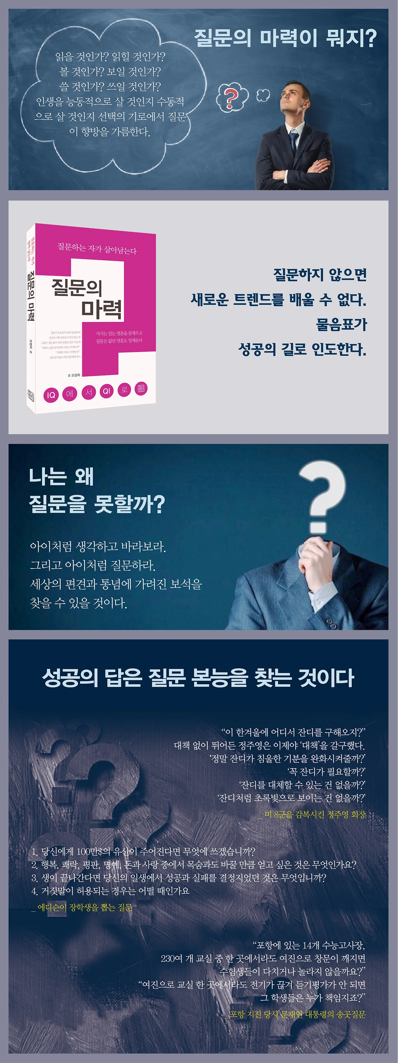 저자는 시대 변화를 이끌었던 글로벌 리더와 여러 혁신 사례의 면면들을 연구하면서 한 가지 공통점을 찾아낸다. 바로 질문하는 능력이다. 위로 올라갈수록 또는 위로 올라가기 위해 필요한 발판이었다는 것이다.