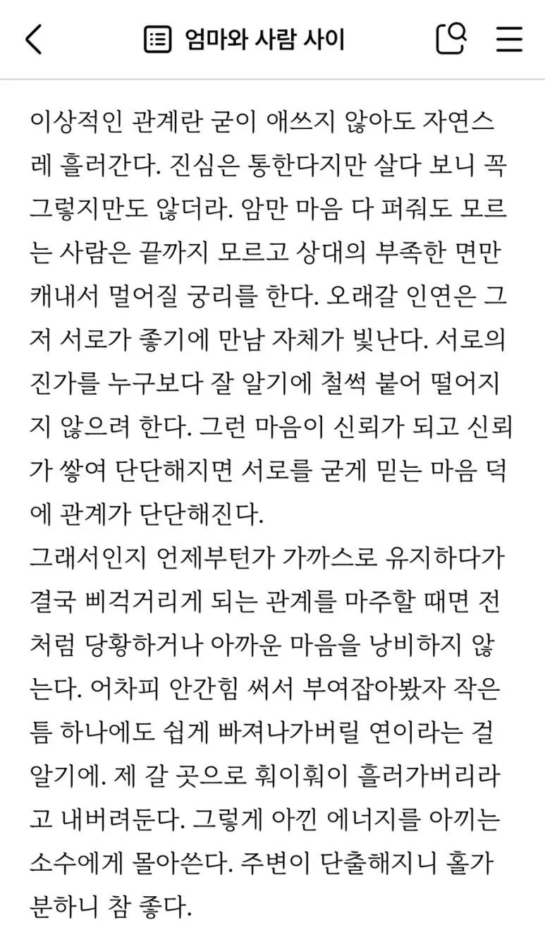 알고 보니 이 사람은 나에게만 그런 게 아니라 자신도 인지하지 못할 만큼 누구에게나 생각 없이 말하는, 항상 자기 마음이 먼저인 사람이었다. 만나고 나면 마음에 찝찝함을 남기는 사람이었지만, 어차피 시절 인연. 마음의 에너지를 낭비하기엔 나만 손해였다.