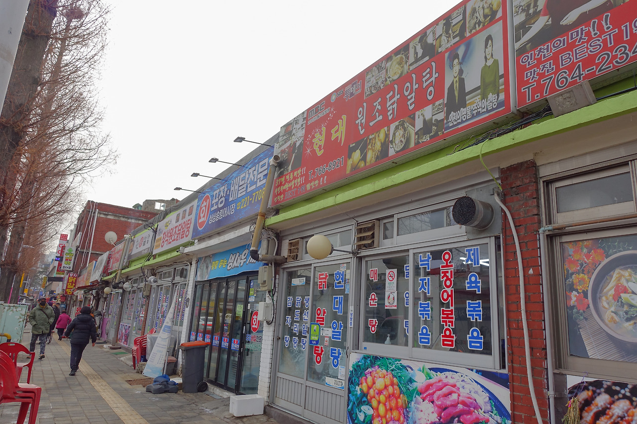 소화할 겸 송림동 현대시장 주변을 돌아보니 시장 맞은편 길가에 줄줄이 늘어선 닭알탕집들이 보였다. 이곳을 닭알탕 거리라고 부르며, 최소 30년 이상 된 노포 식당들이 연속으로 자리하며 닭알탕을 판매한다.
