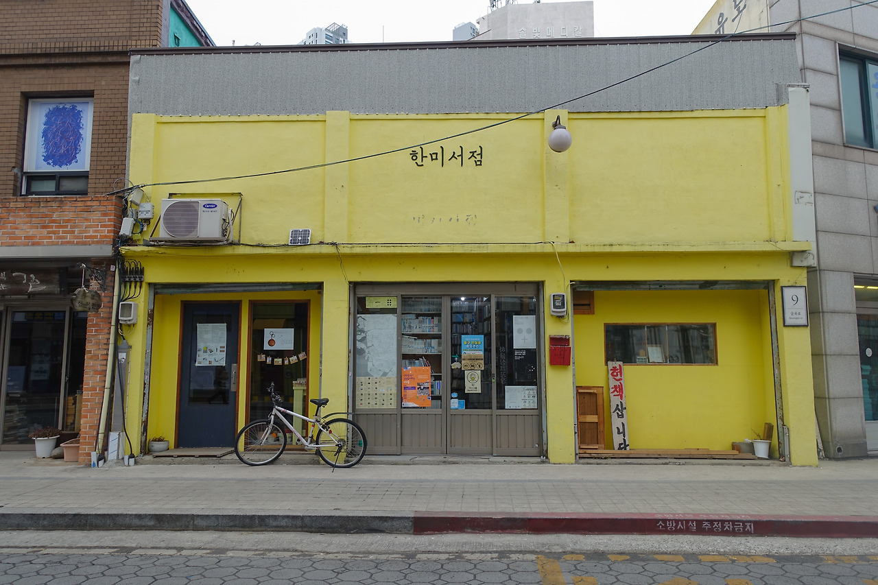 샛노란 색의 외관을 보니 드라마 도깨비 속 주인공이 된 것 마냥 감성에 젖어 한참을 바라봤다. 평화로운 옛 거리에 튀는 색깔의 한미서점, 나도 평화로운 거리 속 이 서점처럼 존재감이 확실한 사람이 되고 싶다고 생각했다.