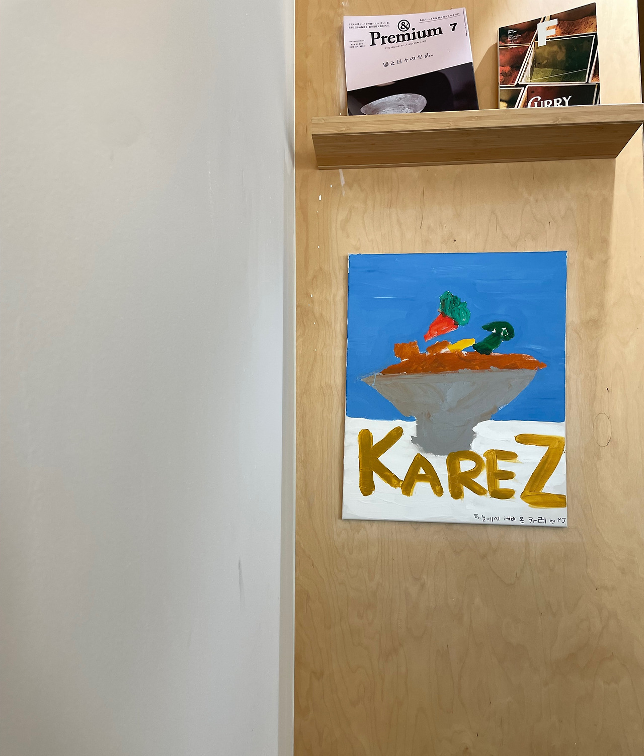 A. 친한 기자 선배의 아들 5살 민제가 그려준 거예요. 가오픈했을 때 저 그림을 들고 와줬어요. 색감이 너무 예쁘고 이름도 '하늘에서 내려온 카레'랍니다. 그래서 저 바탕이 하늘색인 거예요. 하늘에서 카레 식재료들이 떨어지는 모습을 상상하고 그린 것 같은데 너무 예뻐서 저기 걸어뒀어요. 저희 가게가 아무래도 공원에 위치하다 보니까 아이들 데리고 오는 손님들이 많아서 키즈 메뉴를 같이 하고 있기도 하는데, 저런 그림 자체가 아이들이랑 같이 오셨을 때 편안하게 해주는 장식의 기능도 하는 것 같아요.