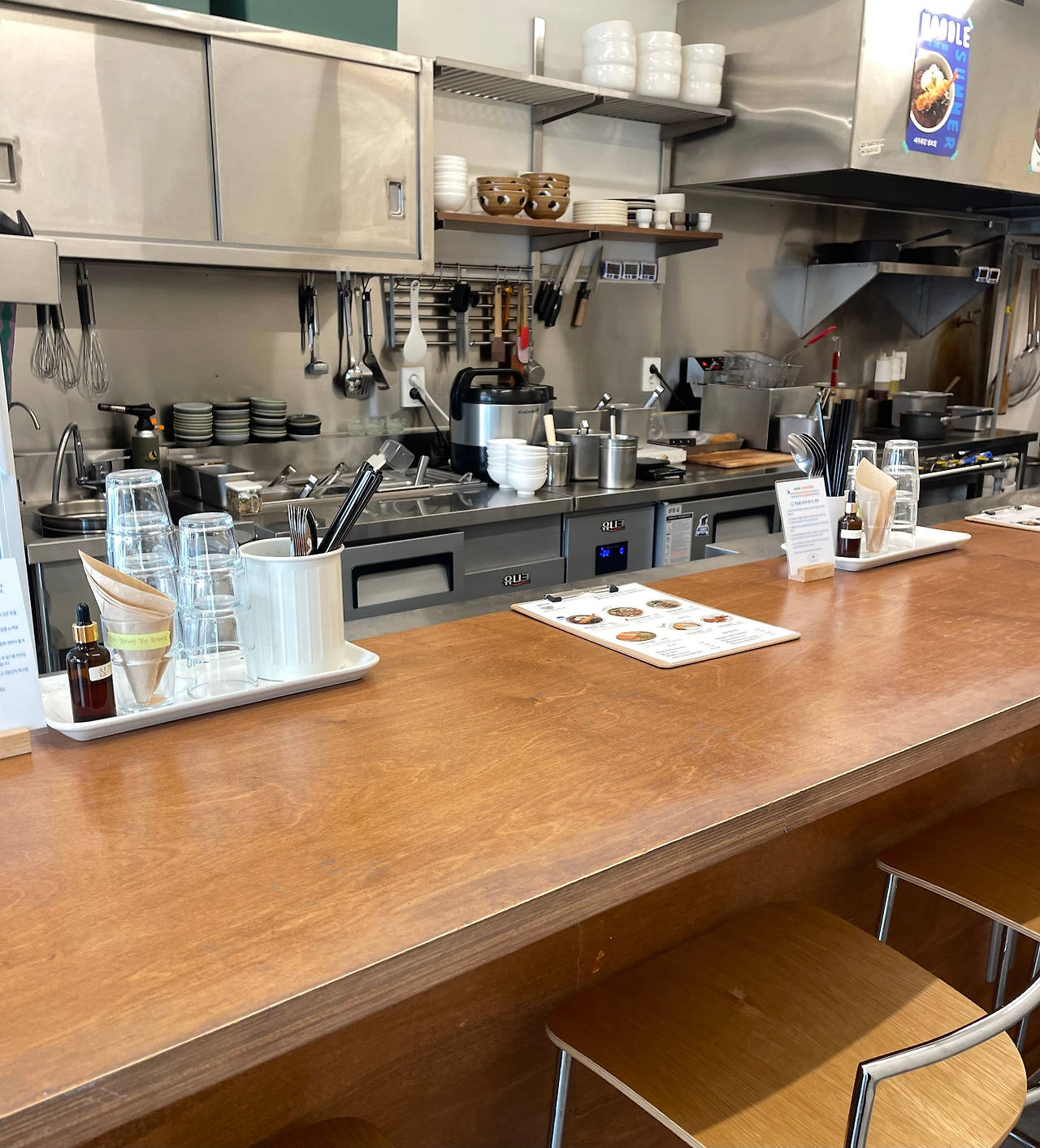 A. 저희가 처음부터 2인 매장으로 기획했어요. 1인도 아니고, 3인도 아닌 딱 저희 둘만 일할 수 있는 공간으로 만들었어요. 홀하고 주방을 분리하게 되면 손님들 응대가 바로 안 되니까 인원이 더 필요해지거든요. 그래서 아무래도 다찌로 하면 직접 손님들 응대가 가능하기 때문에 이렇게 하게 되었어요.