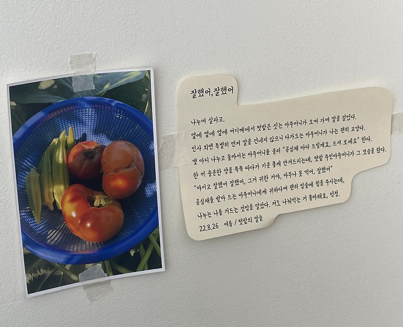 A. 브런치에 글 쓰고 있어요. 가게에 붙어있는 글들도 제가 텃밭 하면서 남겨놨던 글 중 몇 개 뽑아서 걸어둔 거거든요. 앉아서 식사 기다리는 동안 읽어보시면 따뜻할까? 이런 느낌으로 걸어뒀어요. 자주 교체해두고 싶었는데 그럴 여력이 없었어요. 하하하하. 8개월째 같은 글이 벽에 붙어있는데, 자주 오시는 분들은 매번 같은 것만 읽으셨겠네요.. 하하..