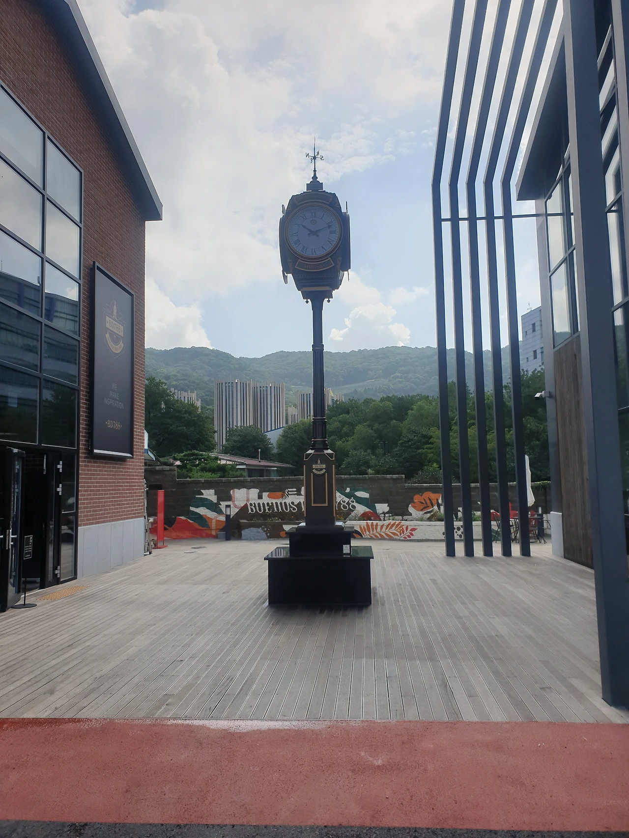 중앙에 시계탑이 있고, 오른쪽 건물로 들어가면 베이커리와 음료를 주문하고 먹을 수 있는 공간이 있다.